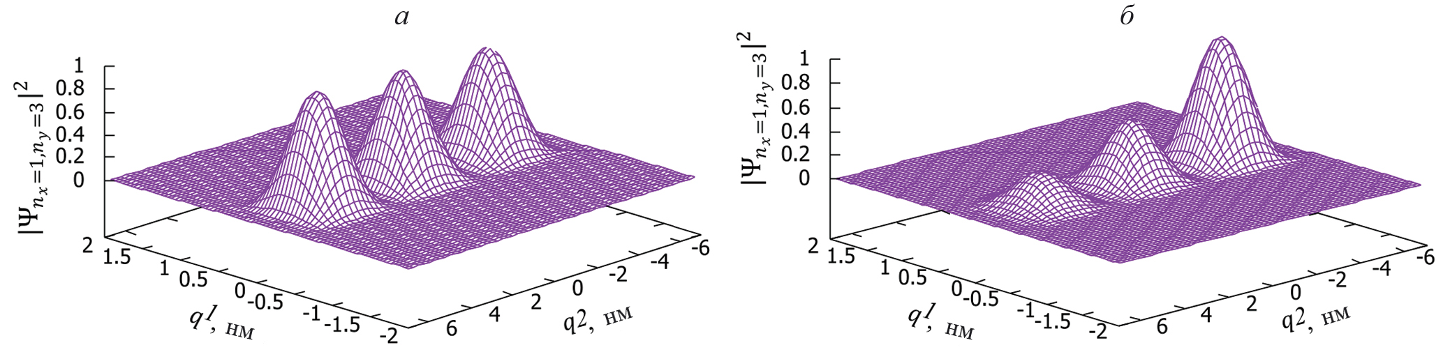 Рис. 4. Волновая функция состояния |nx = 1⟩, |ny = 3⟩. W = 0, Enx = 1, ny = 3 = −6.13926 эВ (а). W = 108 В/м, Enx = 1, ny = 3 = −6.5737 эВ (б).