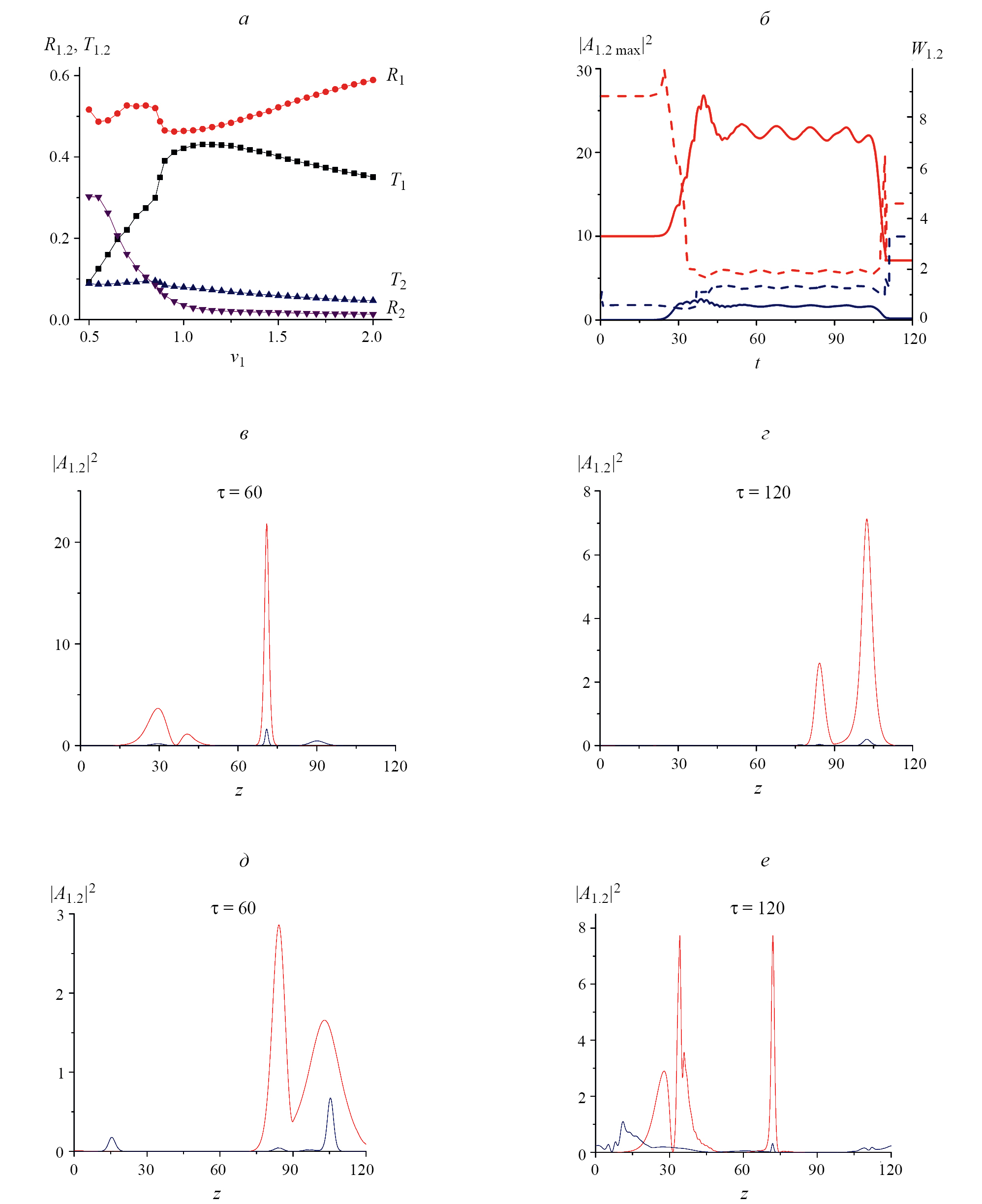 Сначала рассматривался случай пассивной среды g1 = 0, g2 = 0. На рис. 1а приведены зависимости коэффициентов отражения и пропускания от групповой скорости основной частоты. Коэффициент пропускания основной частоты имеет выраженный максимум вблизи , что свидетельствует о том, что более выраженное пропускание происходит при равенстве групповых скоростей. Также можно заметить, что коэффициент отражения на второй гармонике растет с уменьшением v1, следовательно такую среду целесообразно использовать в качестве источника волны второй гармоники при групповых скоростях основной частоты заметно меньших, чем на удвоенной частоте. На рис. 1б приведены зависимости пиковых интенсивностей и ширин пучков от времени в случае . Первоначальный пучок распространяется практически без изменений примерно до момента , после чего часть его попадает в среду, а часть отражается. При этом его интенсивность возрастает, а ширина уменьшается, кроме того генерируется вторая гармоника. Профиль пучка при представлен на рис. 1в, в максимуме основной частоты находится также пик второй гармоники, что показывает, что это именно двуцветный солитон, который с некоторыми осцилляциями движется в среде примерно до момента , после чего интенсивность резко спадает, что объясняется выходом основной части энергии из среды. На рис. 1г приведен профиль пучка при , часть энергии еще находится в среде, а часть уже вышла.