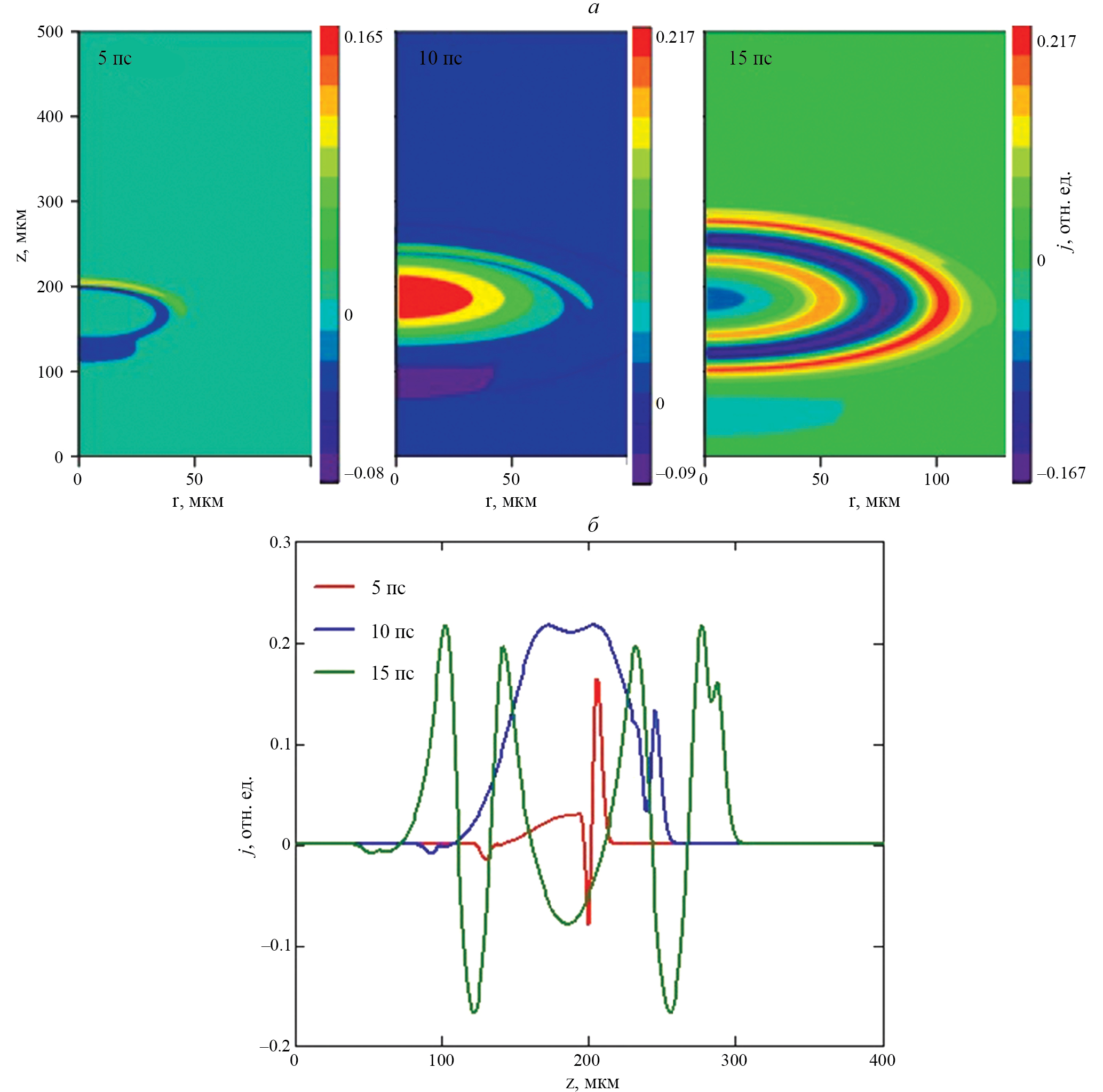 Рис. 1. Эволюция плотности тока в фотонном кристалле с примесными УНТ под действием лазерного импульса в фиксированные момент времени (а). Продольные срезы плотности тока (б).