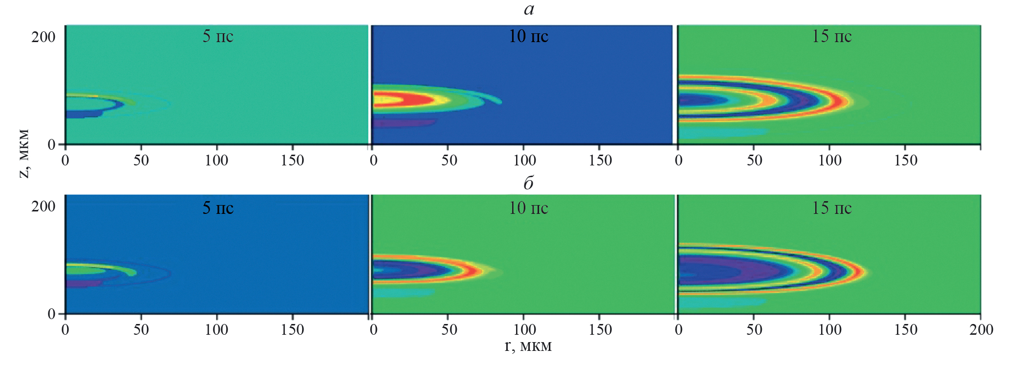 Обратим внимание, что с течением времени, и прохождении предельно короткого лазерного импульса сквозь среду, ток приобретает кольцевую форму, что начинается с примерно 12 пс, и к 15 пс уже хорошо просматривается. Максимальная плотность тока концентрируется не только в месте расположения импульса, но в его модуляционной части. С течением времени максимальное значение плотности тока увеличивается до определенной величины, а затем перестает изменяться, выходя на плато, это происходит в силу периодичности закона дисперсии электронов.