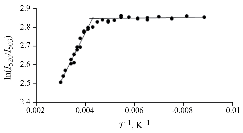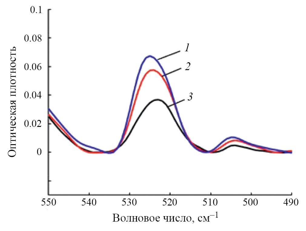 Были зарегистрированы ИК-фурье-спектры образцов в температурном диапазоне от 300 до 100 К. Будучи этаноподобным соединением, 1,2-дифенилэтан имеет транс и гош конформации. В качестве аналитических конформационно-чувствительных полос поглощения были выбраны полосы при 504 (гош) и 520 (транс) [18]. На рис. 3 показаны ИК-фурье-спектры 1,2-дифенилэтана в ПВП при температурах 297, 233 и 173 К. С понижением температуры наблюдали изменение отношения интенсивностей полос поглощения, относящихся к разным конформациям. На рис. 4 изображен график зависимости от обратной температуры логарифма отношения интегральных оптических плотностей ИК-полос поглощения конформаций для 1,2-дифенилэтана в ПВП. Представленные на рис. 3 ИК-фурье-спектры соответствуют температурам, которые отвечают точкам на левой и правой ветвях графика, а также точке пересечения этих ветвей (рис. 4). Эта зависимость позволила определить температуру, ниже которой конформационное равновесие молекул заморожено, т. е. конформационные переходы прекращаются. При температурах ниже температуры замораживания график зависимости параллелен оси абсцисс, то есть отношение интенсивностей конформационно-чувствительных полос не меняется и, следовательно, отношение концентраций конформаций не меняется. Поскольку в полимерах характер локальной подвижности представляет собой повороты фрагментов макромолекулы на некоторые углы вокруг одинарных связей, то полученные температуры отражают замораживание подвижности фрагментов самой макромолекулы. Подвижность таких фрагментов (релаксаторов) макромолекулы замораживается при температурах ниже температуры стеклования и отражает вторичные релаксационные переходы в полимере.