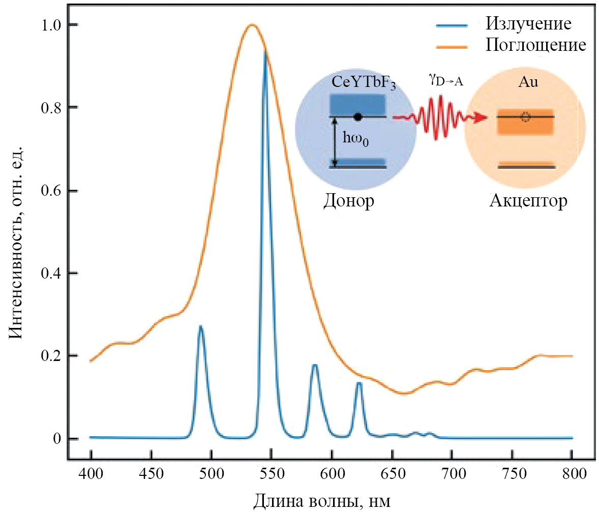 Рис. 1. Нормированный экспериментальный спектр люминесценции ионов Tb3+ (синий спектр) и спектр поглощенной в золоте мощности (оранжевый спектр). Во вставке представлено схематичное изображение безызлучательной передачи энергии от донора к акцептору.
