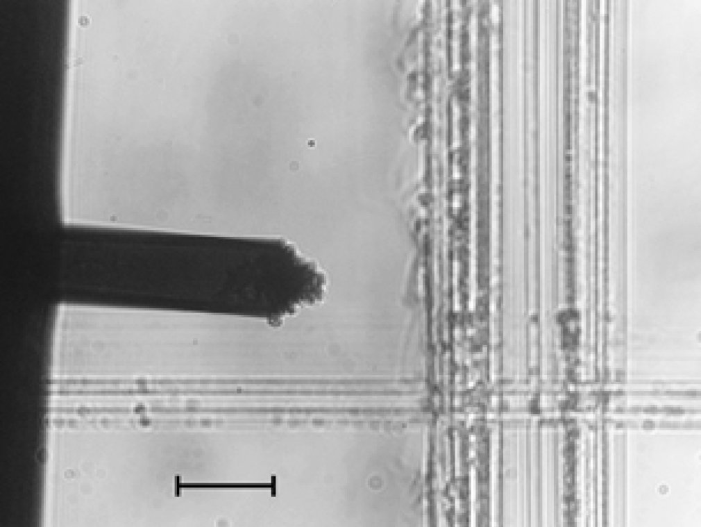 Рис. 1. Оптическое изображение АСМ-балки с зондом после процесса сканирования в контактном режиме. Балка с зондом покрыта агломератами наночастиц. Вид снизу вверх, подсветка сверху. Размер масштабного отрезка 45 мкм.