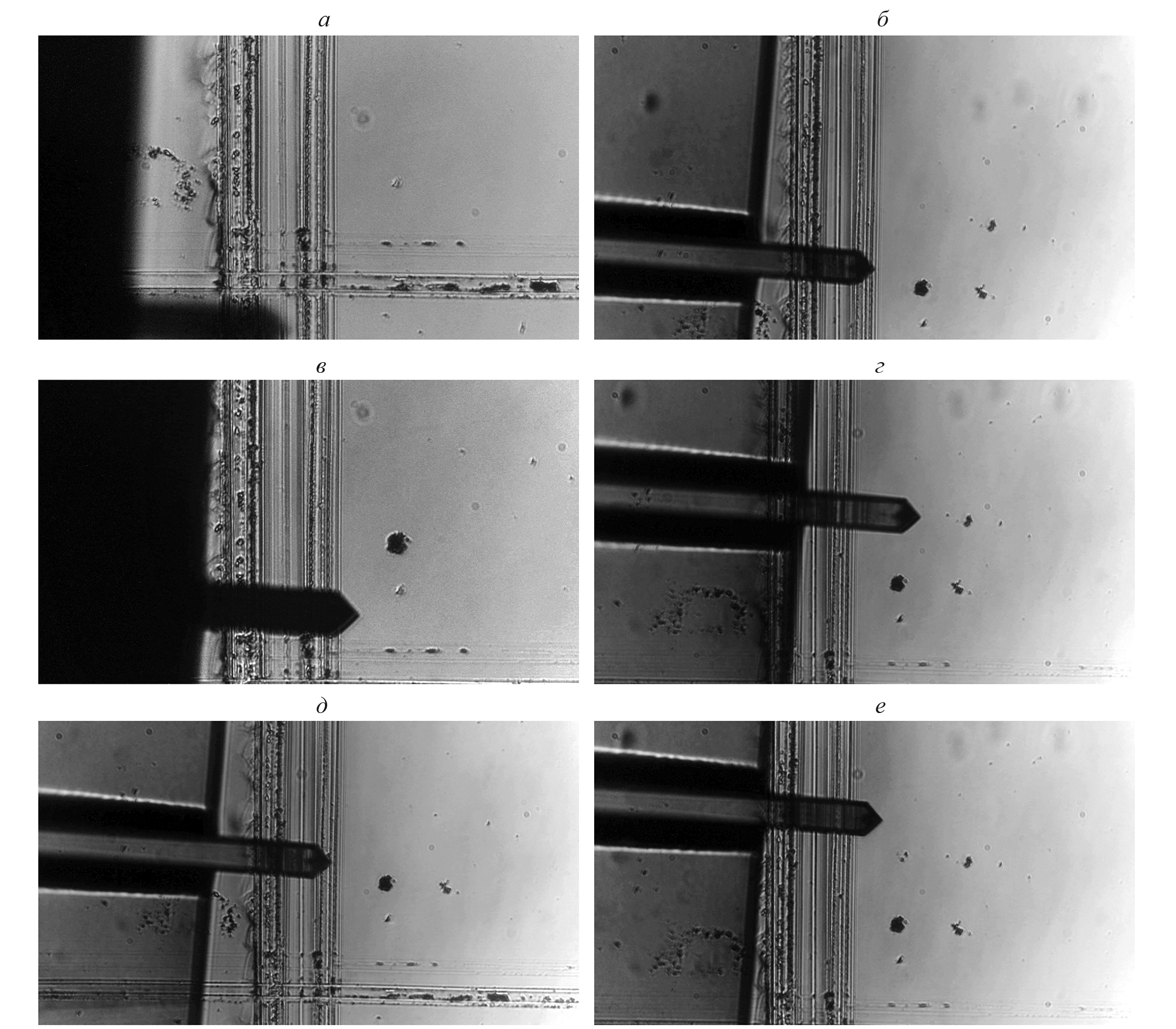 С помощью оптического микроскопа визуально идентифицировали область образца с пересечением меток и оценивали степень заполнения участка АНЧ. За основу был взят алгоритм манипуляции, разработанный для очистки участка поверхности с АНЧ с изолированием в высохшей капле раствора выбранного объекта или группы объектов [5, 6]. Зонд АСМ подводили к поверхности в полуконтактном режиме (когда зонд испытывает вынужденные колебания на резонансной частоте балки, и обратная связь работает по изменения амплитуды колебаний), поверхность сканировали и проверяли на наличие в этой области АНЧ, затем сканировали поверхность большой площади (порядка 90×90 мкм). Во время сканирования контролировали перемещения зонда и поведение пленки с АЧН в области зонда с помощью оптического микроскопа. Как правило, на этом этапе не удавалось получать качественные АСМ изображения поверхности, наблюдали большое количество характерных полос, совпадающих с направлением сканирования (т. н. «брейков»), которые, по всей видимости, возникают из-за большого перепада высот и взаимодействия зонда с вязкими остатками раствора. Далее АСМ переводили в контактный режим (когда зонд не испытывает вынужденных колебаний, обратная связь работает по отклонению балки кантилевера от положения равновесия). Сила давления зонда на поверхность возрастала и по примерным оценкам составляла 50—100 нН для зондов марки NSG 01. В этом режиме запускали процесс сканирования достаточно большой области (квадрат с размером стороны 80—90 мкм). В оптический микроскоп при этом наблюдали утончение пленки в месте сканирования. Можно предположить, что происходило «соскребание» остатков раствора, содержащего АНЧ, с поверхности подложки. Часть вытесненной пленки и АНЧ выдавливались к краю поля сканирования, другая часть прилипала к балке и зонду, что наблюдалось визуально в оптический микроскоп (рис. 1).