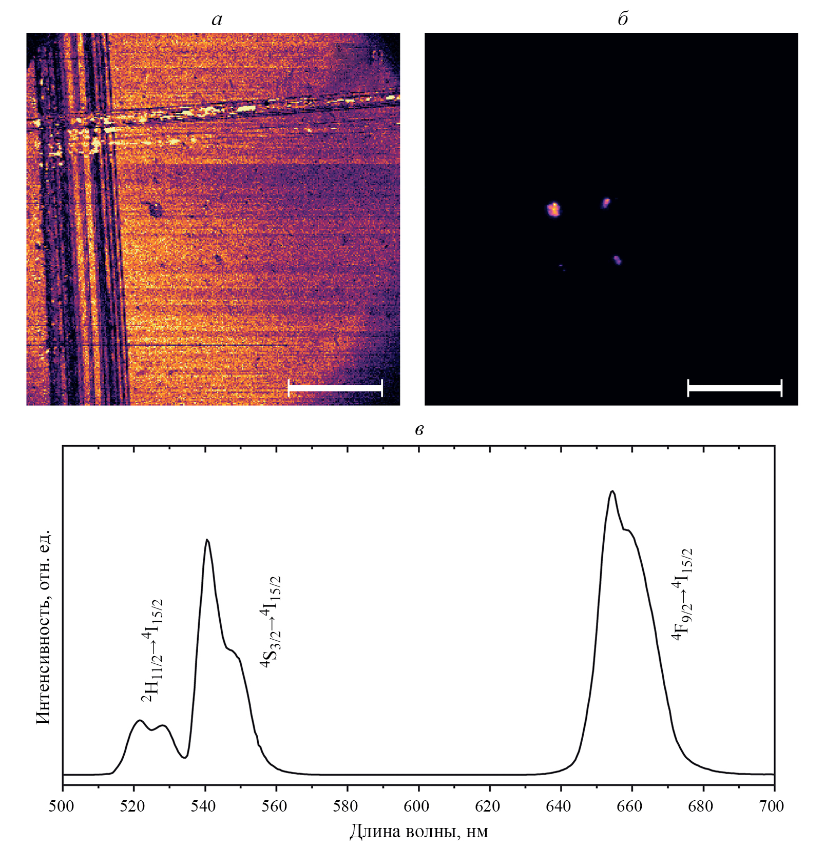 Апконверсионный люминесцентный отклик метки детектировали с оптического конфокального микроскопа. Вначале сканировали отраженное от поверхности излучение для определения координат меток-царапин на поверхности подложки, что обеспечивало позиционирование с микронной точностью (см. рис. 3а). Затем перед детектором был установлен светофильтр, отсекающий излучение на длине волны лазера 980 нм. Это позволило получить сигнал апконверсионной люминесценции от наночастиц и определить их координаты (см. рис. 3б). На данном изображении хорошо видна сформированная метка апконверсионного излучения в углах квадрата. Следует отметить, что интенсивность люминесцентного сигнала пропорциональна количеству материала, используемого для создания метки. Верификация апконверсионного излучения происходила следующим способом. Известно, что наночастицы поглощают лазерное излучение на длине волны 980 нм, и излучают в видимом диапазоне. Спектр их излучения представлен на рис. 3в. Он состоит из узких эмиссионных линий ионов эрбия : полосы в областях 525, 550 и 660 нм соответствуют излучательным переходам , и [7].
