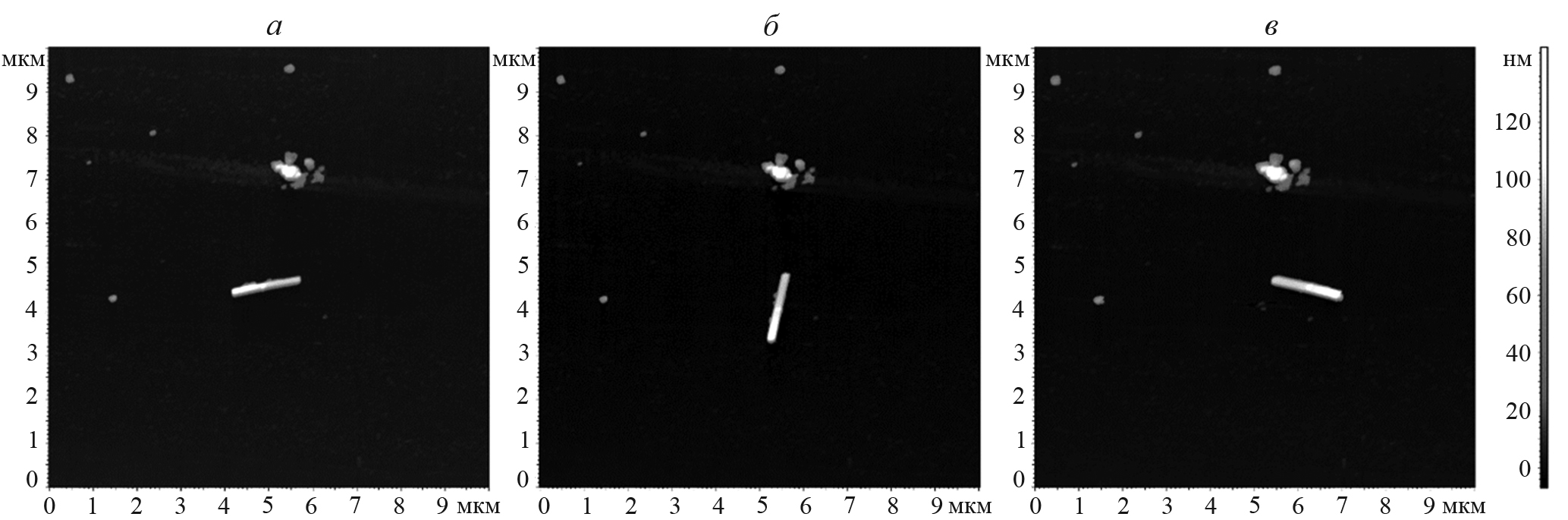 Полученные в полуконтактном режиме АСМ изображения (рис. 3б) анализировали, на выбранном участке поверхности выбирали несколько (1—5) наиболее интересных для дальнейших исследований объектов и начинали расчистку от всех остальных частиц и остатков раствора. Для этого АСМ переводили в контактный режим работы. Далее в исследуемой области поверхности выбирали такое поле сканирования (меньшей площадью) и задавали такое направление сканирования, которое позволяло оттеснить все объекты в этом поле к краю. Обычно использовали прямоугольные поля сканирования размером в несколько десятков микрон. Скорость сканирования для поля размером 20 × 10 мкм2 составляла примерно 0.8 Гц. Сила давления зонда на поверхность составляла 0.2—0.7 мкН. Ток рассогласования фотодиода выставлялся около 2 нА (что соответствовало силе взаимодействия около 0.2 мкН) и при необходимости увеличивался до 5 нА (примерно 0.7 мкН). После сканирования в контактном режиме АСМ снова переводили в полуконтактный режим и сканировали область чуть больше расчищенной для проверки качества очистки. Если из данной области не были убраны все лишние объекты, то процедуру повторяли.