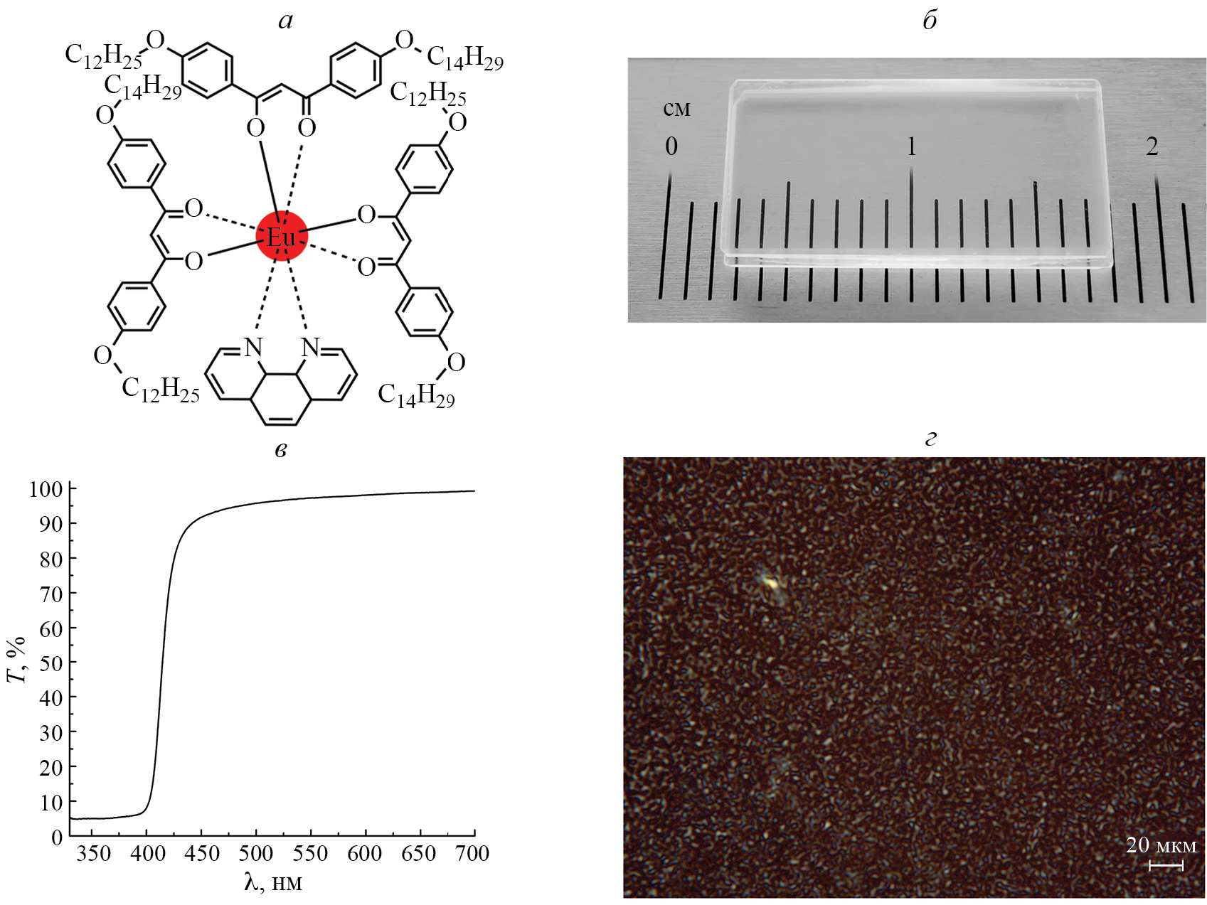 Рис. 1. Структурная формула мезогенного бета-дикетонатного комплекса Eu(DK12-14)3phen (а). Фотография 20 мкм застеклованной пленки Eu(DK12-14)3phen (закрепленной между двумя кварцевыми пластинами размером 7×15×0.5 мм3) при дневном освещении (б). Спектр пропускания 20 мкм застеклованной пленки Eu(DK12-14)3phen (в). Микрофотография поверхности застеклованной пленки Eu(DK12-14)3phen, полученная в режиме скрещенных поляризаторов при 500-кратном увеличении (г).