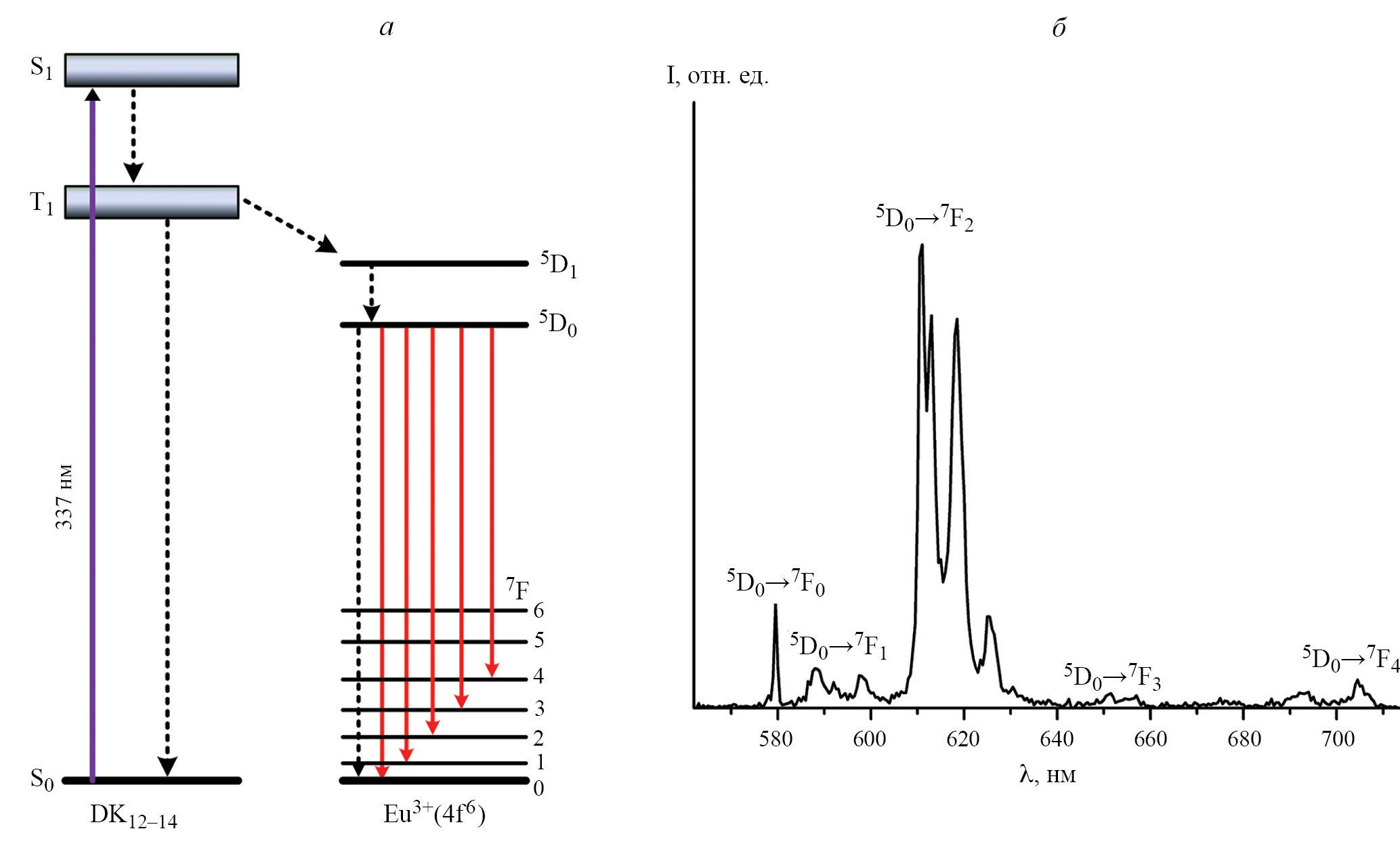 Рис. 2. Диаграмма энергетических уровней для застеклованной пленки Eu(DK12-14)3phen (а). Сплошными и штриховыми стрелками показаны излучательные и безызлучательные переходы, соответственно. Спектр люминесценции застеклованной пленки Eu(DK12-14)3phen, полученный при задержке 10 мкс относительно возбуждающего лазерного импульса с длиной волны 337 нм (б).