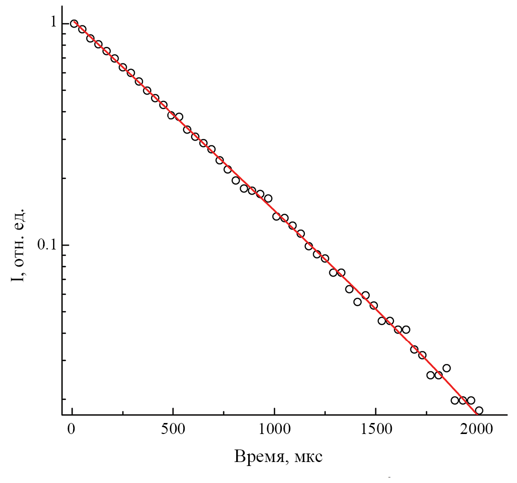 Рис. 3. Нормированная кинетика люминесценции ионов Eu3+ на длине волны 610.5 нм в застеклованной пленке Eu(DK12-14)3phen. Сплошная линия ‒ одноэкспоненциальная аппроксимационная функция с коэффициентом корреляции R2 = 0.99959.
