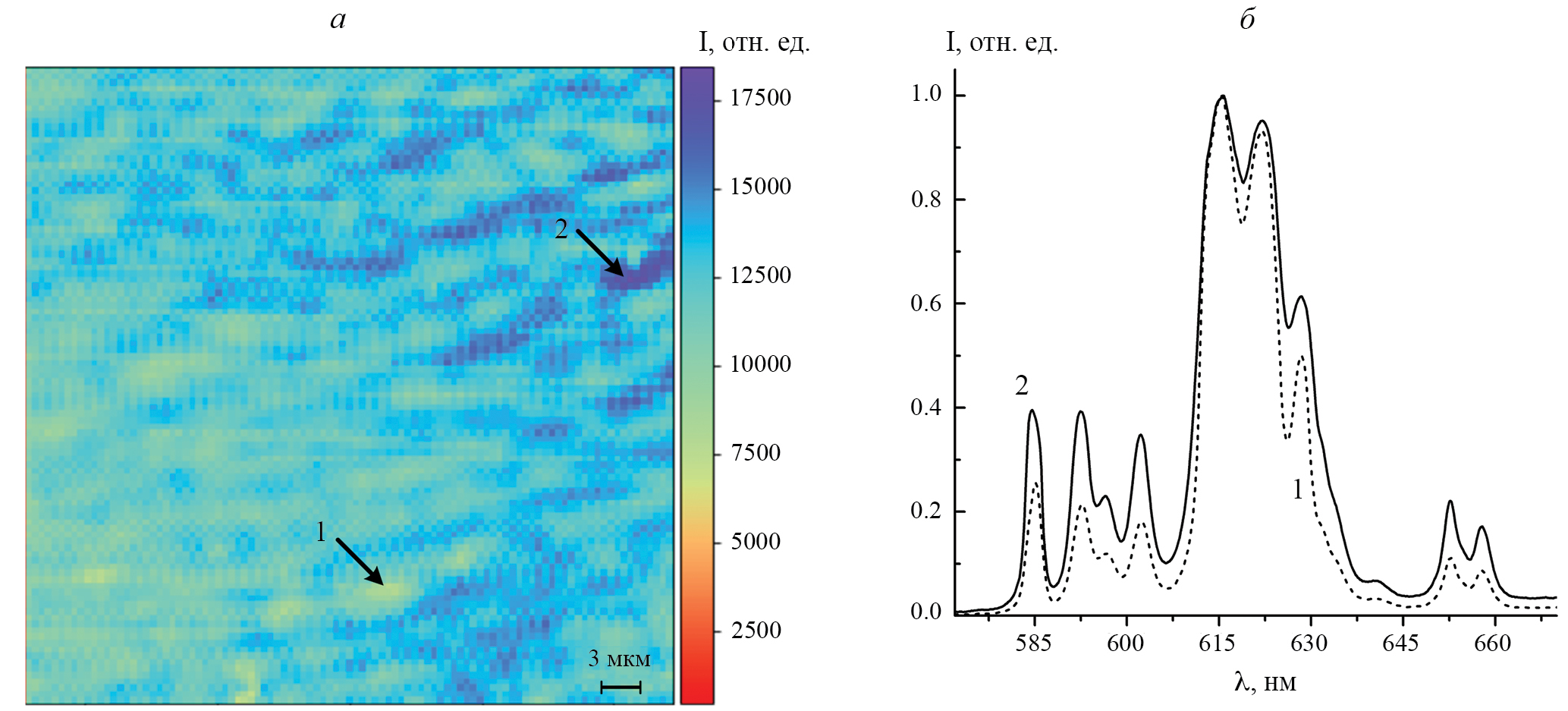 Рис. 4. Распределение интенсивности люминесценции на поверхности застеклованной пленки Eu(DK12-14)3phen при лазерном возбуждении на длине волны 405 нм, полученное на конфокальном оптическом микроскопе (а). Спектры люминесценции застеклованной пленки Eu(DK12-14)3phen (б), измеренные в положениях 1 и 2 на панели (а).