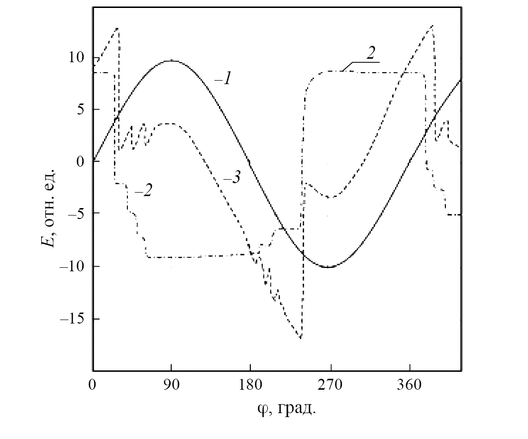 Рис. 1. Диаграмма распределения электрического поля в полости дефекта в зависимости от фазы приложенного поля Ea: 1 — приложение поля Ea в полости дефекта, 2 — поле индуцированных зарядов Ei на диэлектрических поверхностях полости, 3 — суммарное поле в полости Eg = Ei ± Ea.