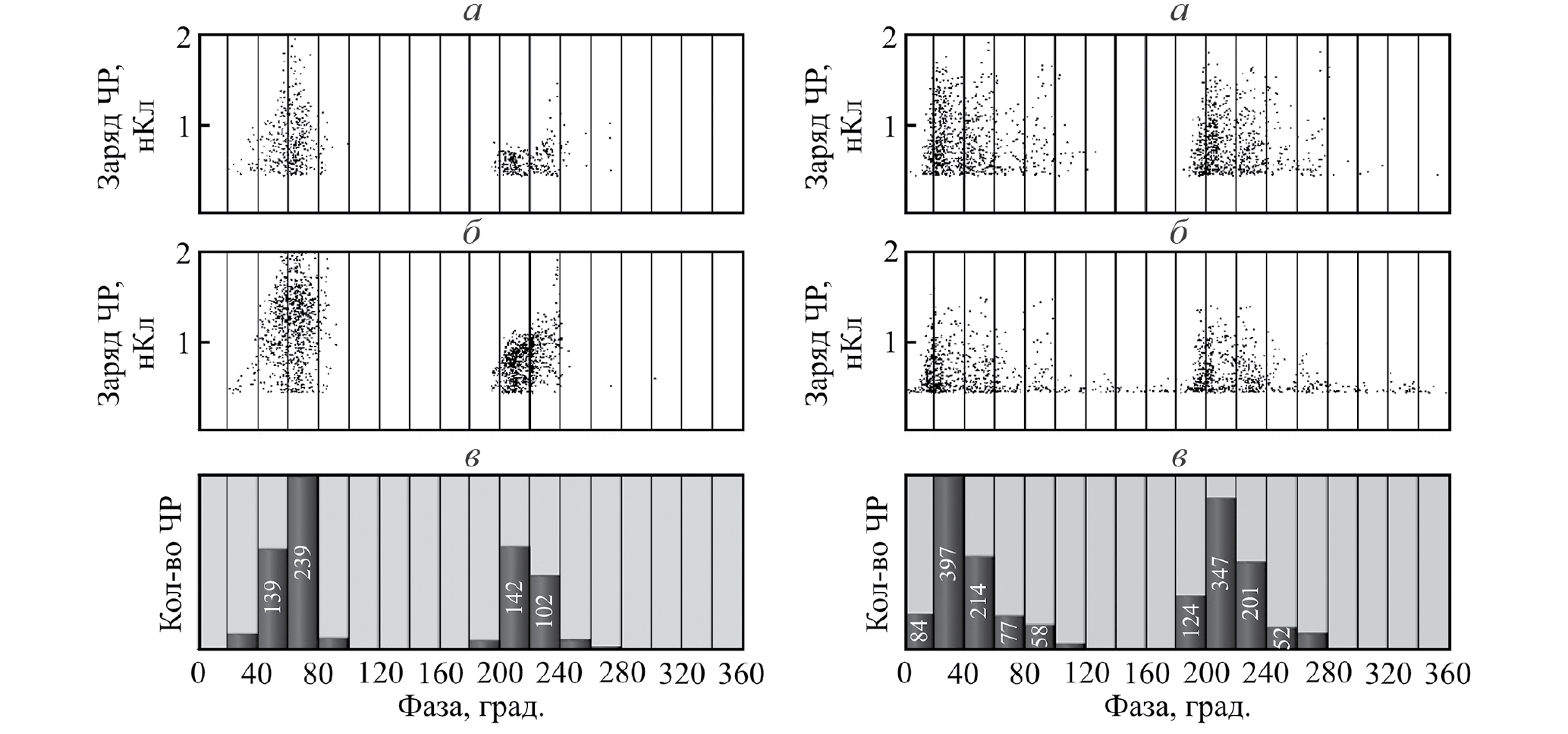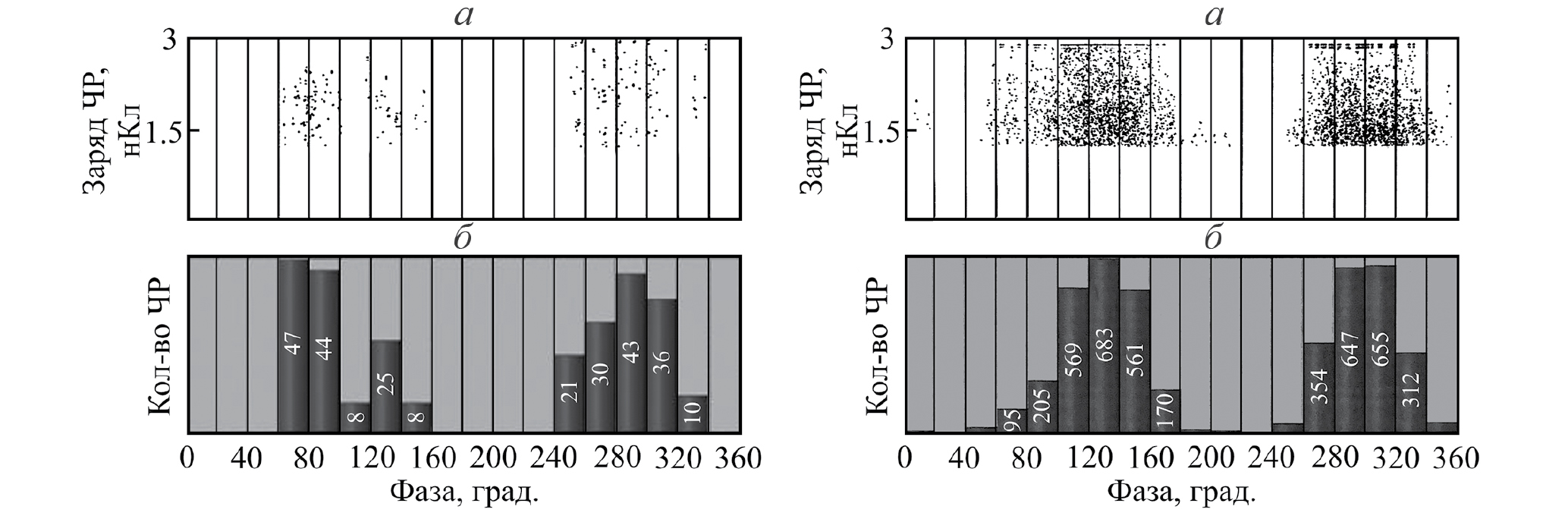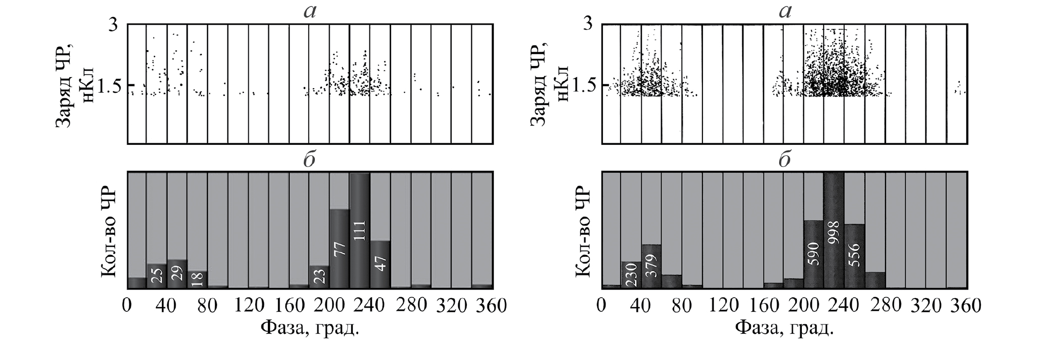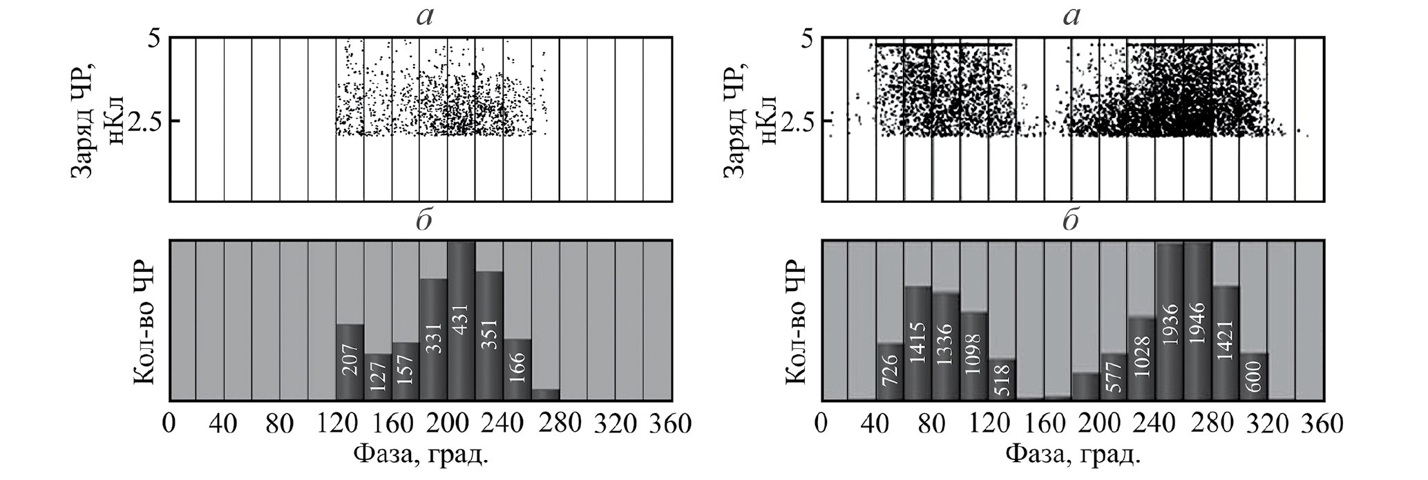 Рис. 4. Амплитудно-фазовые характеристики ЧР (а) и фазовое распределение количества ЧР (б), детектированные электромагнитным (слева) и акустическим (справа) датчиками, для полимерного изолятора, близкого по состоянию к дефектному.
