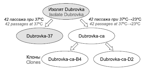 The Dubrovka-37 variant did not replicate in the Vero cell culture at 23ºC, while the Dubrovka-ca, Dubrovka-ca-B4, and Dubrovka-ca-D2 variants on the 7th day reached the titer of 4.5–8.0 TCID50/ml, depending on MOI.