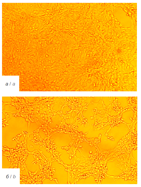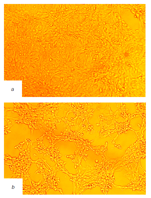 Fig. 2. Cytopathic effect of the Dubrovka-ca strain in the Vero cell culture at 23ºC (the 7th day after the infection). a — non-infected cells; b — Dubrovka-ca. MOI 0.001.