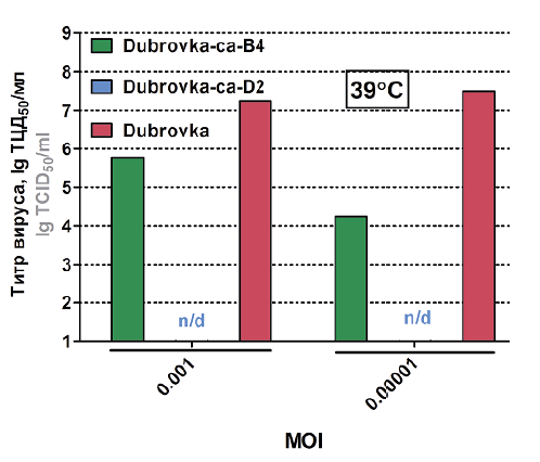 Fig. 6. The virus titer on the 3rd day after the Vero cell culture had been infected with the Dubrovka strain and Dubrovka-ca-B4 and Dubrovka-ca-D2 variants; at the culture temperature of 39ºC and different MOI.The cells were infected with virus variants, and the virus titer was measured in the culture liquid 72 hours after the infection. The results of 2 independent tests are presented as mean values. n/d — not detected.