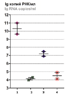 Fig. 7. Concentration of the viral RNA in Calu-3 cells infected with SARS-CoV-2 variants, the 3rd day after the infection, at MOI 0.001.1 — Dubrovka strain (the 2nd passage); 2 — Dubrovka-ca-B4; 3 — Dubrovka-ca-D2; 4 — Dubrovka-37. The results of 2 independent tests are presented as mean values.