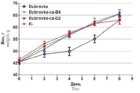 Fig. 8. Kinetics of the weight of hamsters infected intranasally with the Dubrovka strain and Dubrovka-ca-B4 and Dubrovka-ca-D2 variants.From the 0th to the 4th day — n = 9 per group; from the 6th to the 8th day — n = 5 per group. The infective dose — 4.0 lg TCID50. K– — non-infected hamsters.