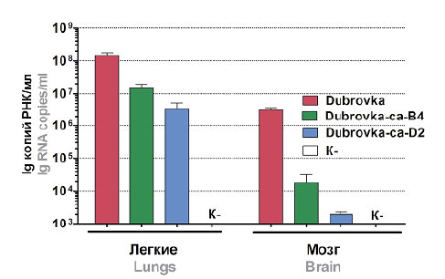 Fig. 9. Concentration of the viral RNA in lung and brain homogenates from hamsters infected intranasally with the Dubrovka strain and Dubrovka-ca-B4 and Dubrovka-ca-D2 variants, 4th day after the infection.n = 4 per group. K– — non-infected hamsters.