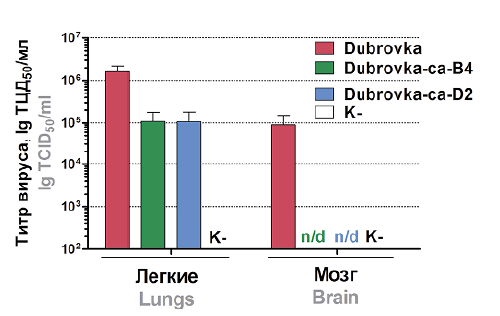 Fig. 10. The virus titer in lung and brain homogenates from hamsters infected intranasally with the Dubrovka strain and Dubrovka-ca-B4 and Dubrovka-ca-D2 variants, the 4th day after the infection.n = 4 per group. K– — non-infected hamsters.