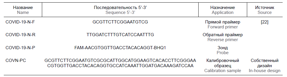 To detect viral RNA by real-time RT-PCR, we used primers and the probe to the SARS-CoV-2 nucleocapsid N gene: COVID-19-N-F, COVID-19-N-R, COVID-19-N-P (Table) [22]. To perform real-time RTPCR, we used the reagent kit "2.5× reaction mix for real-time PCR with Taq DNA polymerase" and M-MLV reverse transcriptase (Syntol). The reaction mix of 25 µl contained 10 pmol of each primer and 5 pmol of the probe, Taq DNA polymerase, 30 units of reverse transcriptase. The temperature and time parameters were as follows: 45ºC — 10 min (1 cycle); 95ºC — 5 min (1 cycle); 95ºC — 5 sec, 55ºC — 45 sec (45 cycles). The reaction was performed in a DTprime thermocycler (DNA-Technology). All the primers and probes were produced by Syntol. To build the calibration graph, we used specimens obtained from serial ten-fold dilutions of synthetic oligonucleotide COVN-PC (Table) with the specified concentration.