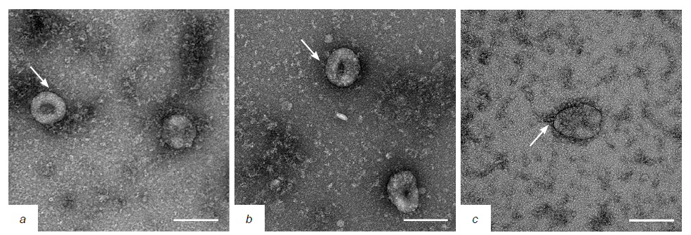 Fig. 4. Electron microphotography of UV inactivated variants of SARS-CoV-2. a — Dubrovka; b — Dubrovka-ca-B4; c — Dubrovka-ca-D2. TEM. Negative contrasting with 1% uranyl acetate.The arrow shows S-protein trimers on the surface of the coronavirus. The scale bar — 100 nm.