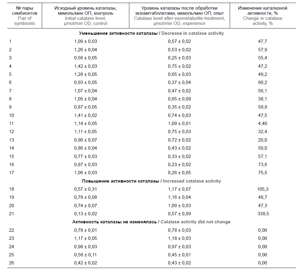 Супернатанты энтерококков по-разному воздействовали на грибы C. albicans (таблица). В 65,4% случаев энтерококки ингибировали каталазу микромицетов, в 19,2% случаев каталазная активность у грибов после обработки супернатантами E. faecalis не изменялась, и только в 15,4% случаев продукция каталазы увеличивалась. Исходный уровень каталазы у интактных культур C. albicans в среднем составил 1,02 [ 0, 87; 1, 13] мкмоль/мин ОП, после обработки экзометаболитами E. faecalis снизился до 0,55 [ 0, 36; 0, 73] мкмоль/мин ОП (p < 0,05).