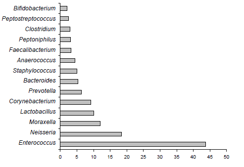 При проведении анализа метагеномных данных установлено, что среднее содержание эукариотической ДНК в образцах — 28,0 ± 7,4%. Коэффициент альфа-разнообразия варьировал от 3 до 82 (среднее арифметическое 19,1; стандартное отклонение 22,0). Микробный пейзаж характеризовался преобладанием представителей родов Enterococcus, Neisseria, Lactobacillus, Corynebacterium, Prevotella, Bacteroides и др. (рисунок). Среди генетического материала прокариотических клеток во всех образцах детектировали фрагменты генома Enterococcus faecalis в значительном количестве. Неожиданной находкой явились детектируемые с постоянством генетические маркеры Moraxella spp., доля которых в метагеноме превышала 10%. M. osloensis занимали среди них лидирующие позиции (11,7 ± 9,3%).