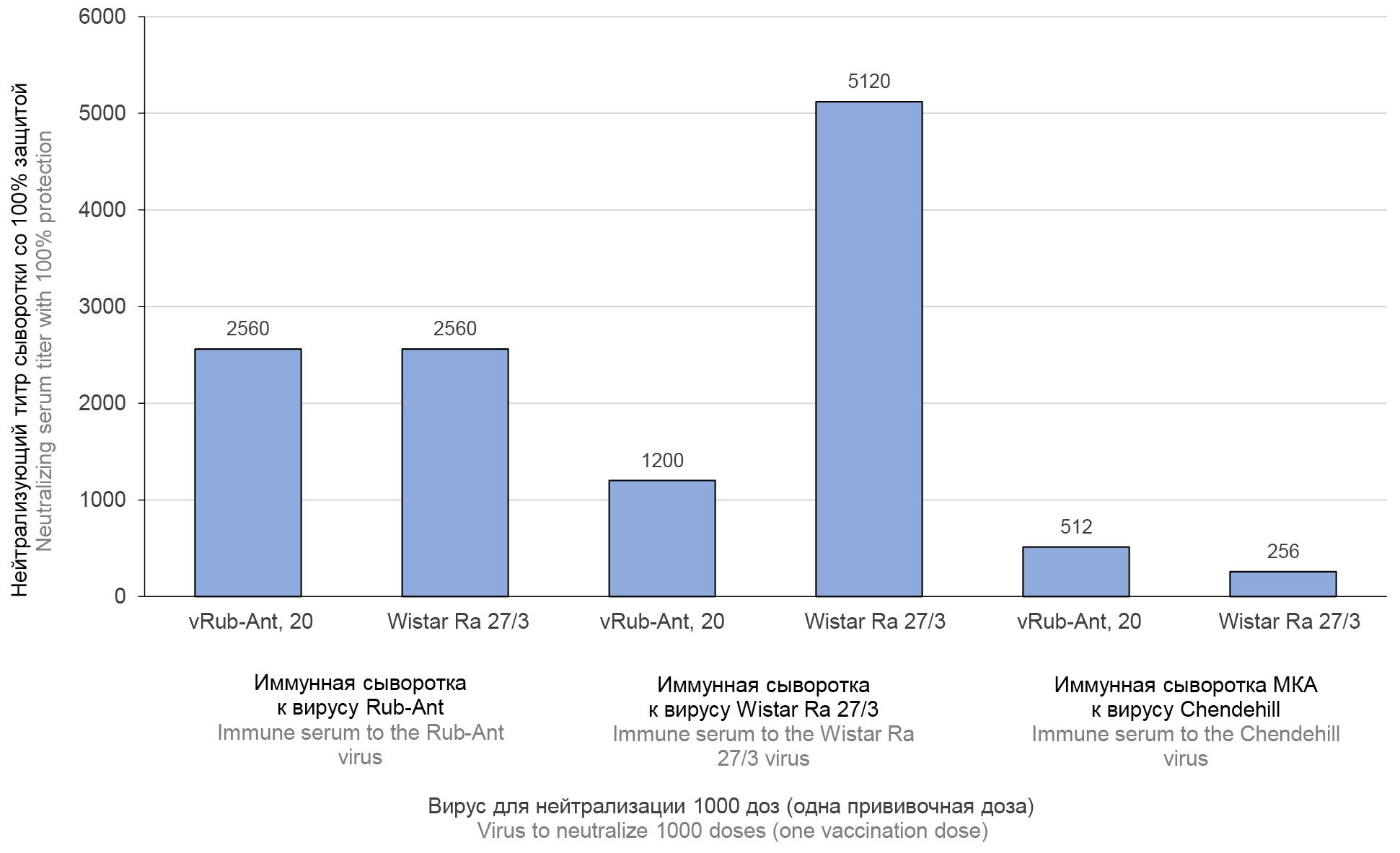 Для оценки сравнительной иммуногенности аттенуированных штаммов RV поставлена перекрёстная реакция нейтрализации указанных штаммов RV с сыворотками морских свинок, иммунизированных подкожно одной прививочной дозой, смесью 2 МКА к штамму Chendehill (C-74) RV. Высокая иммуногенность отечественного вакцинного ха-штамма vRub-Ant подтверждается высокими титрами иммунных сывороток морской свинки в РН со 100% защитой против 1000 доз RV штаммов vRub-Ant и штамма Wistar RA 27/3, а также МКА к штамму С-74 RV (рис. 2).