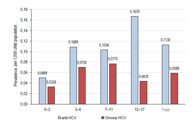 The prevalence of HCV infection (based on the available data) among children and adolescents in MR is not less than 0.113/1,000 children population; the prevalence of the confirmed pediatric CHCV in MR was around 0.059/1,000 by the time of this publication.