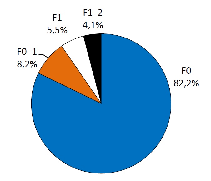 The stage of fibrosis according to the METAVIR scale F1–2 | 5 | 17,2 | 2 | 5,4 | 0,122 |