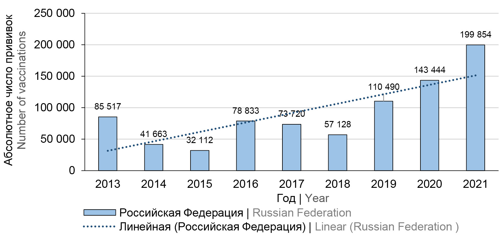 Fig. 3. Dynamics of people vaccinated against CP in Russia in 2013–2021.