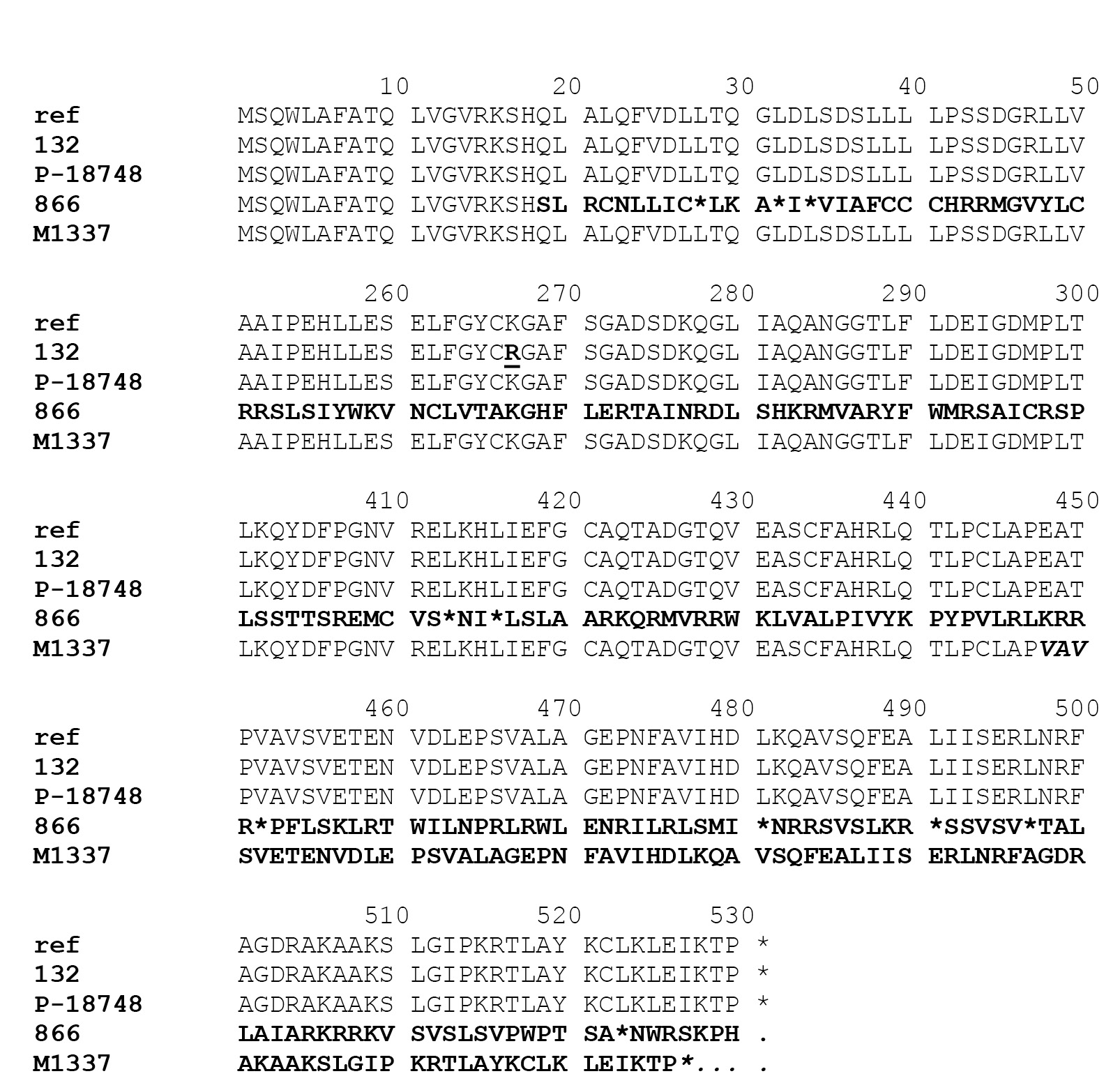 Фрагменты аминокислотной последовательности белка VasH некоторых штаммов V. cholerae. ref — референс-штамм V. cholerae N16961 О1 El Tor биовара. Жирным шрифтом выделены изменённые участки. / Fragments of the amino acid sequence of VasH protein of some Vibrio cholerae strains. ref — reference strain V. cholerae N16961 O1, El Tor biovar. Altered regions are highlighted in bold.