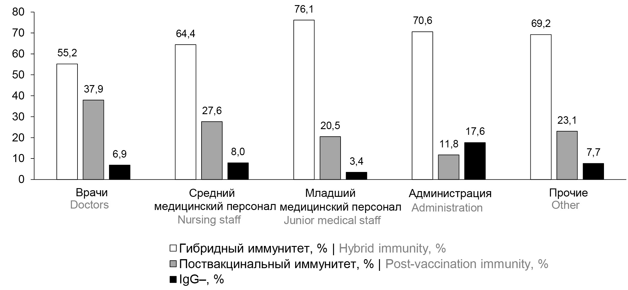 Во всех профессиональных группах выявлялись лица с разными видами иммунитета: гибридным, поствакцинальным и с отсутствием IgG-антител к RBD Spike SARS-CoV-2. При этом удельный вес лиц с гибридным иммунитетом также превалировал во всех профессиональных категориях, находясь в пределах от 76,1% (максимальный уровень среди младшего обслуживающего персонала) до 55,2% (минимальный уровень среди врачей; рис. 1).