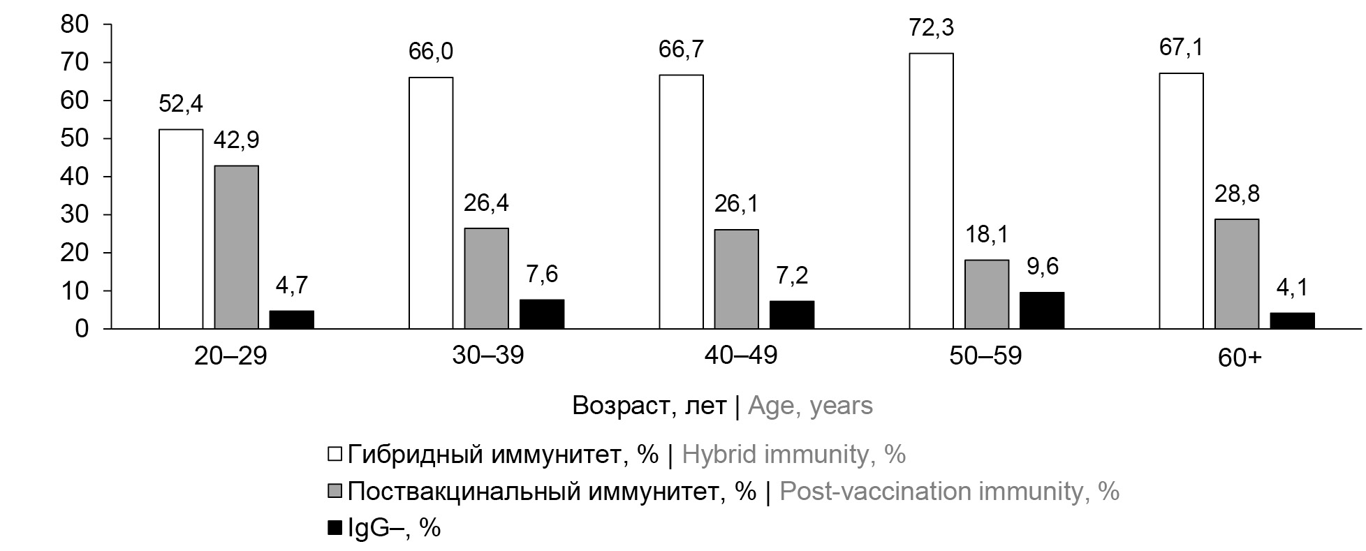 Определено, что 67,4% (95% ДИ 61,9–72,6%) составляют лица с гибридным иммунитетом, 25,5% (95% ДИ 20,7–30,7%) — лица с поствакцинальным иммунитетом после иммунизации вакциной «Гам-КОВИД-Вак», 7,1% (95% ДИ 4,5–10,6%) — неиммунные. Разность между лицами с гибридным и поствакцинальным иммунитетом достоверная (t > 2).