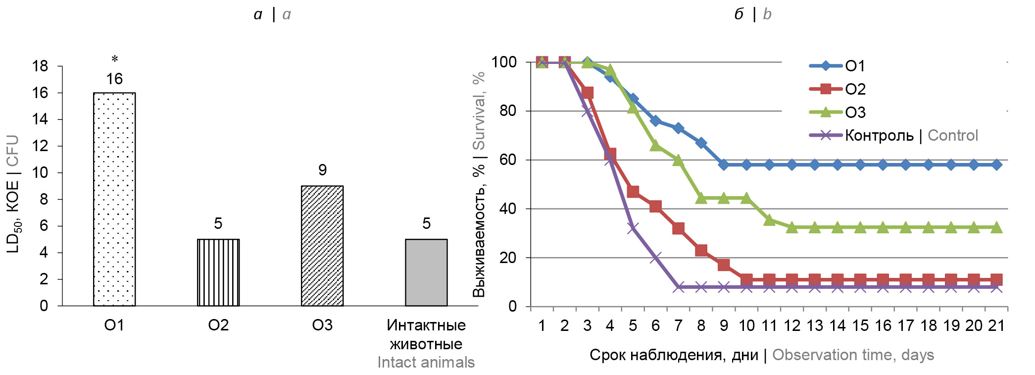 На первом этапе проводили расчёт ЛД50 заражающего вирулентного штамма основного подвида Y. pestis 231(708) и оценку влияния иммуномодуляторов О1, О2 и О3 на изменение показателя ЛД50 заражающего вирулентного штамма основного подвида Y. pestis 231(708). Невакцинированным животным перед заражением трёхкратно подкожно вводили иммуномодуляторы. Если для интактных белых мышей ЛД50 штамма Y. pestis 231(708) составила 5 (4–6) КОЕ, то в группе животных, которым перед заражением трёхкратно подкожно был введён иммуномодулятор О1, — 16 (13–18) КОЕ, т.е. был в 3 раза выше, чем у неиммунизированных животных (рис. 1, а), и коррелировал с увеличением средней продолжительности жизни у павших животных этой группы в среднем на 36 ч (рис. 1, б). Применение иммуномодуляторов О2 и О3 в аналогичной схеме существенно не влияло на развитие чумной инфекции у биомодели и не изменяло значение ЛД50 заражающего штамма.
