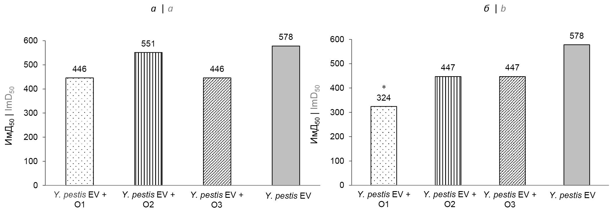 Рис. 2. Значение ImD50 для штамма Y. pestis EV линии НИИЭГ на фоне введения олигопептидов О1, О2, О3 по схеме 1 (а) и схеме 2 (б) перед заражением морских свинок 400 ЛД50 Y. pestis 231. *р < 0,05 при сравнении с вакцинированными только Y. pestis EV линии НИИЭГ.