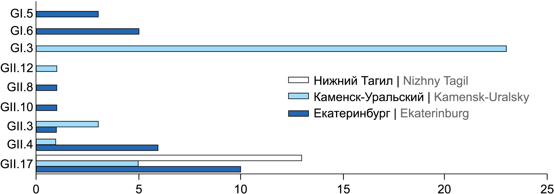 Всего за анализируемый период было исследовано 220 образцов клинического материала. По результатам секвенирования удалось типировать 73 возбудителя НВИ, что составляет 33% общего объёма исследованных образцов. В результате генотипирования по Сэнгеру установлено, что наибольший удельный вес в генотипическом профиле норовирусов приходится на вторую геногруппу GII (n = 42 (58%)), норовирусы GI (n = 31 (42%)). Выявлены различные генотипы возбудителей НВИ на территории отдельных муниципалитетов (рис. 1). Генотипическое распределение полученных последовательностей имеет следующий вид: GII.17 (n = 28; 40%); GI.3 (n = 23; 33%); GII.4 (n = 7; 10%,); GI.6 (n = 5; 7%); GII.3 (n = 4; 6%); G1.7 (n = 3; 4%). Норовирусы, относящиеся к генотипам GII.17, GI.3, являются доминирующими вирусами, выявленными на территории отдельных муниципалитетов в Свердловской области за 2022 г. (рис. 2).