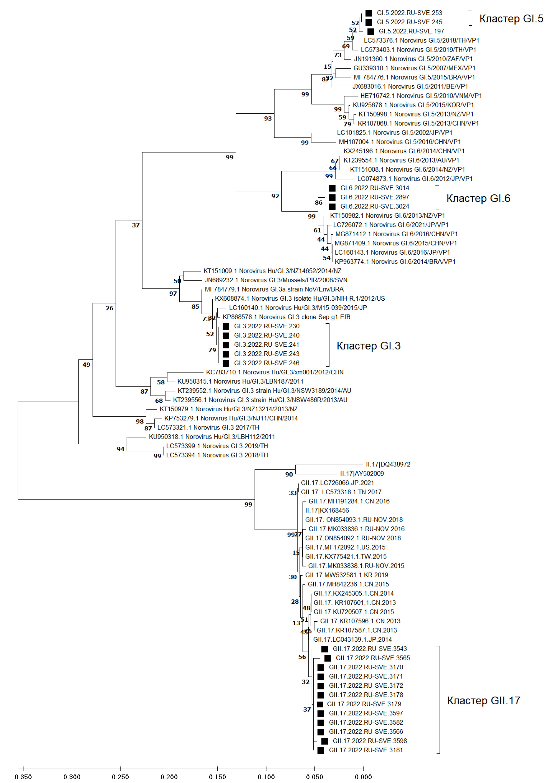 Рис. 3. Филогенетическое древо, основанное на фрагменте главного капсидного белка, построенное на основе нуклеотидных последовательностей норовирусных генотипов GI.5, GI.6, GI.3, GII.17.