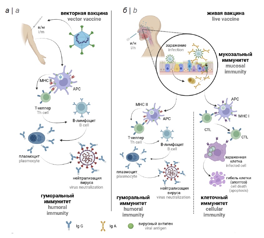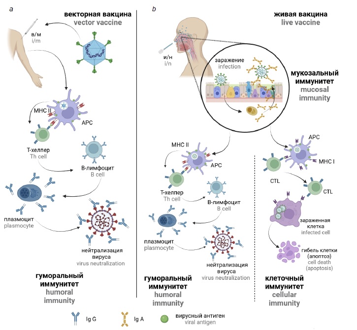 Fig. 2. Mechanisms of induction of an immune response by the intramuscular immunization vaccine containing the S protein and by intranasal vaccination of LAV. a — vaccines against COVID-19, which are based on the S protein of SARS-CoV-2 (using the example of the viral vector vaccine), induce only a humoral response involving production of virus-neutralizing antibodies; b — LAV triggers the mechanisms inducing acquired immunity, which are similar to those engaged in natural infection, including activation not only humoral, but also cell-mediated immunity. In intranasal administration, the vaccine strain infects epithelial cells of the upper respiratory tract, thus inducing both local (mucosal) and systemic immune responses. The established protection including cellular and humoral components provides immunity both at the level of the entrance gate of the infection (mucosa) and at the systemic level. i/m — intramuscular injection; i/n — intranasal; APC — antigen-presenting cell; CTL — cytotoxic lymphocyte; MHC — major histocompatibility complex.