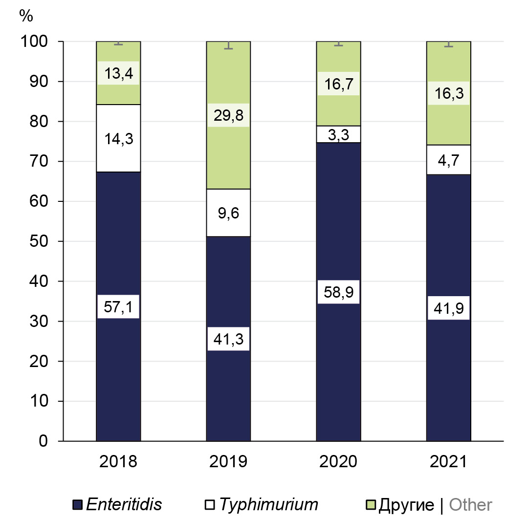 За время исследований было выделено 28 серотипов S. enterica. Доминирующими были изоляты серотипа Enteritidis (n = 182; 50,80 ± 0,20%): в 2018 г. их доля составила 57,10 ± 0,27% (n = 68), в 2019 г. — 41,30 ± 0,22% (n = 43), в 2020 г. — 58,9 ± 0,27% (n = 53), в 2021 г. — 41,90 ± 0,12% (n = 18) (рис. 1). От 3,30 ± 0,12% (n = 3) в 2020 г. до 14,30 ± 0,56% (n = 17) в 2018 г. сальмонелл принадлежало серотипу Typhimurium (n = 61; 17,00 ± 0,15%). Все остальные серотипы составляли наименьшую долю (от 0,30 ± 0,01 до 2,50 ± 0,06%), поэтому были отнесены в группу «другие», которая составляла от 13,40 ± 0,16 до 29,80 ± 0,25% культур. Культуры в данной группе принадлежали серотипам Agona, Blegdam, Brandenburg, Bredeney, Chester, Derby, Dublin, Essen, Fyris, Give, Goettingen, Goma, Infantis, Jerusalem, Kapemba, Kottbus, London, Mbandaka, Munchen, Panama, Saintpaul, Sandiego, Tsevie, Virchow.
