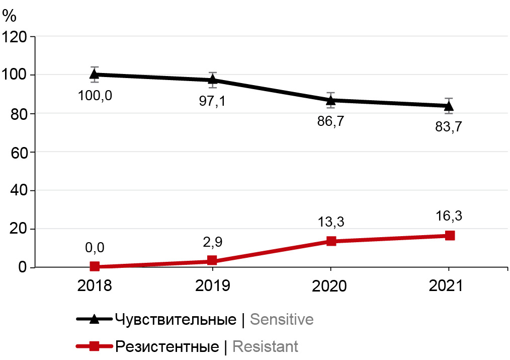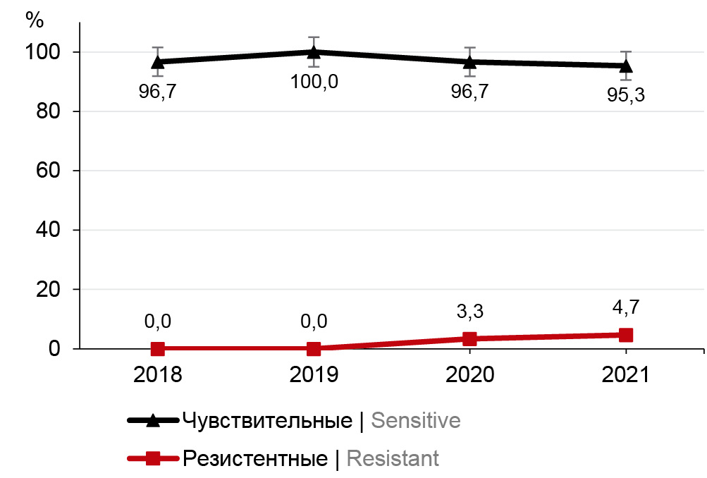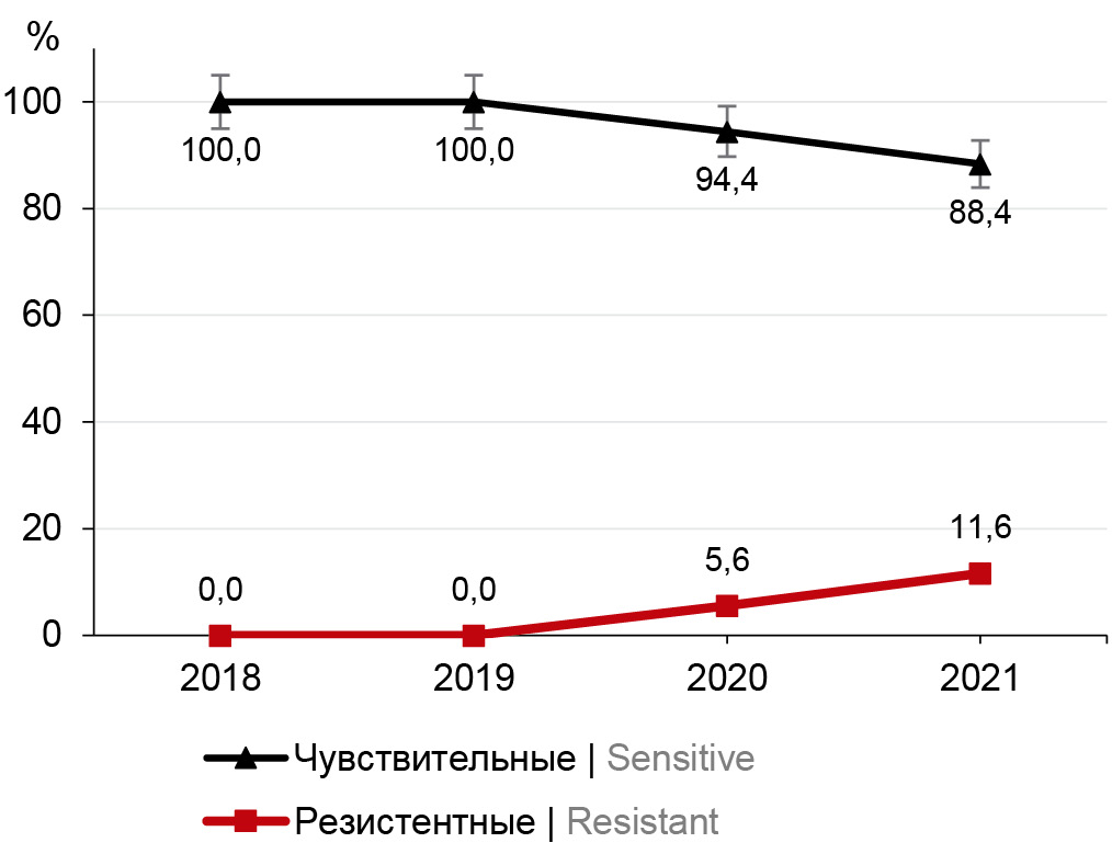 Анализ фенотипической чувствительности сальмонелл показал тенденцию к снижению активности цефалоспоринов 3-го поколения, несмотря на высокий процент фенотипически чувствительных культур: с 100% в 2018 г. до 83,70 ± 0,14% в 2021 г. (рис. 3). Вместе с тем на протяжении всего периода исследований наблюдался ежегодный рост фенотипически резистентных культур сальмонелл.