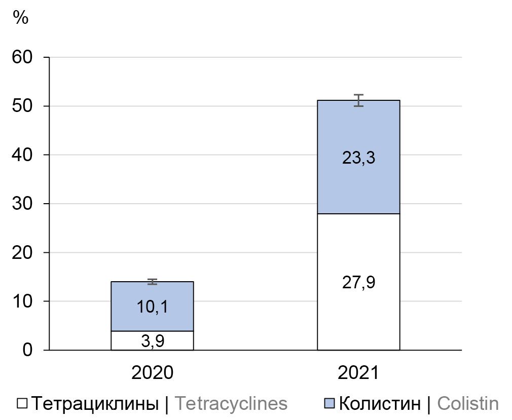 В 2020 и 2021 гг. была проведена оценка чувствительности выделенных культур Salmonella к колистину и тетрациклинам как препаратам резерва в отношении микроорганизмов с множественной устойчивостью. Колистин остаётся единственным препаратом последнего резерва, подходящим для лечения опасных для жизни инфекций, вызываемых карбапенем-устойчивыми энтеробактериями. В ряде стран и регионов уже выявлены колистин-резистентные бактерии, вызывающие инфекции, против которых в настоящее время не существует эффективных антибиотиков [9]. В проведённом нами исследовании была выявлена динамика к увеличению доли фенотипически колистин-резистентных изолятов микроорганизмов в 2,3 раза (с 10,10 ± 0,18% в 2020 г. до 23,30 ± 0,58% в 2021 г.) и тетрациклин-резистентных культур — в 7,2 раза (с 3,9 ± 0,1% в 2020 г. до 27,90± 0,65% в 2021 г.; рис. 5). Кроме того, антибиотиками резерва с широким спектром действия являются ко-тримоксазол и хлорамфеникол, к которым на протяжении всего периода наблюдений сохранялась низкая доля резистентных культур: от 4,8 ± 0,1 до 6,70 ± 0,13% и от 3,80 ± 0,07 до 7,4 ± 0,12% соответственно.