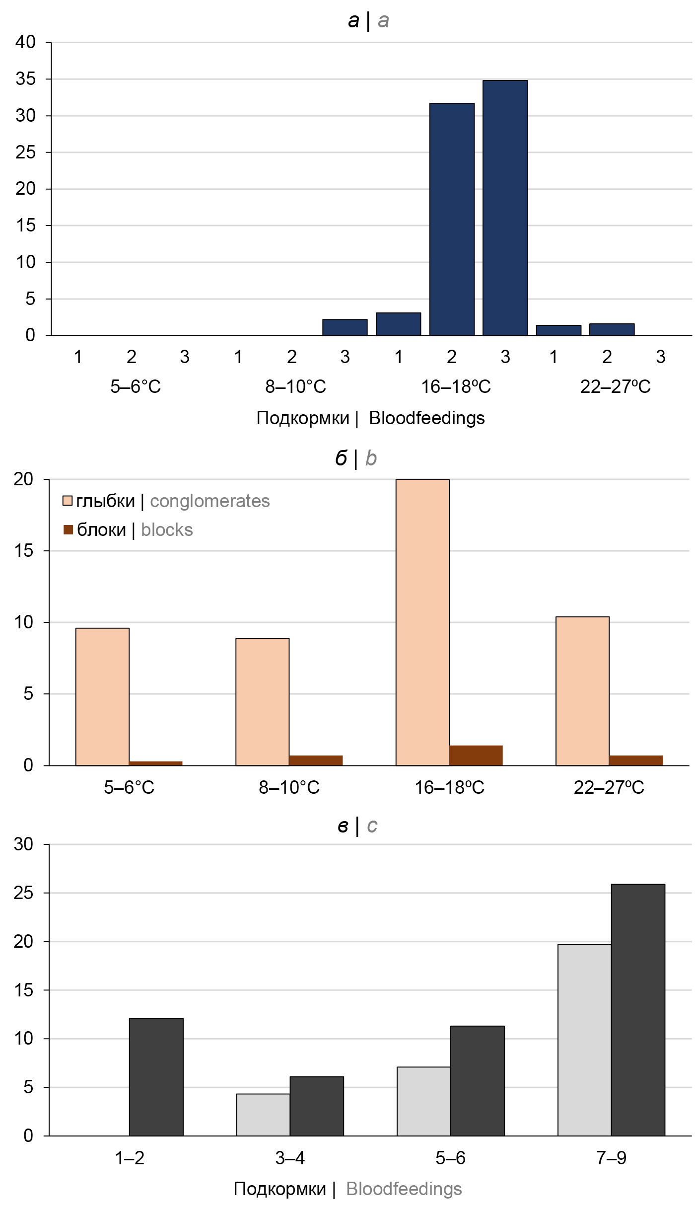 а — начало формирования глыбок при разной температуре; б — частота формирования конгломератов при разной температуре; в — начало формирования бактериальных глыбок в зависимости от периода между заражающим кормлением блох и периодическими подкормками (серые столбики — 3-и сутки, черные столбики — 16-е сутки).