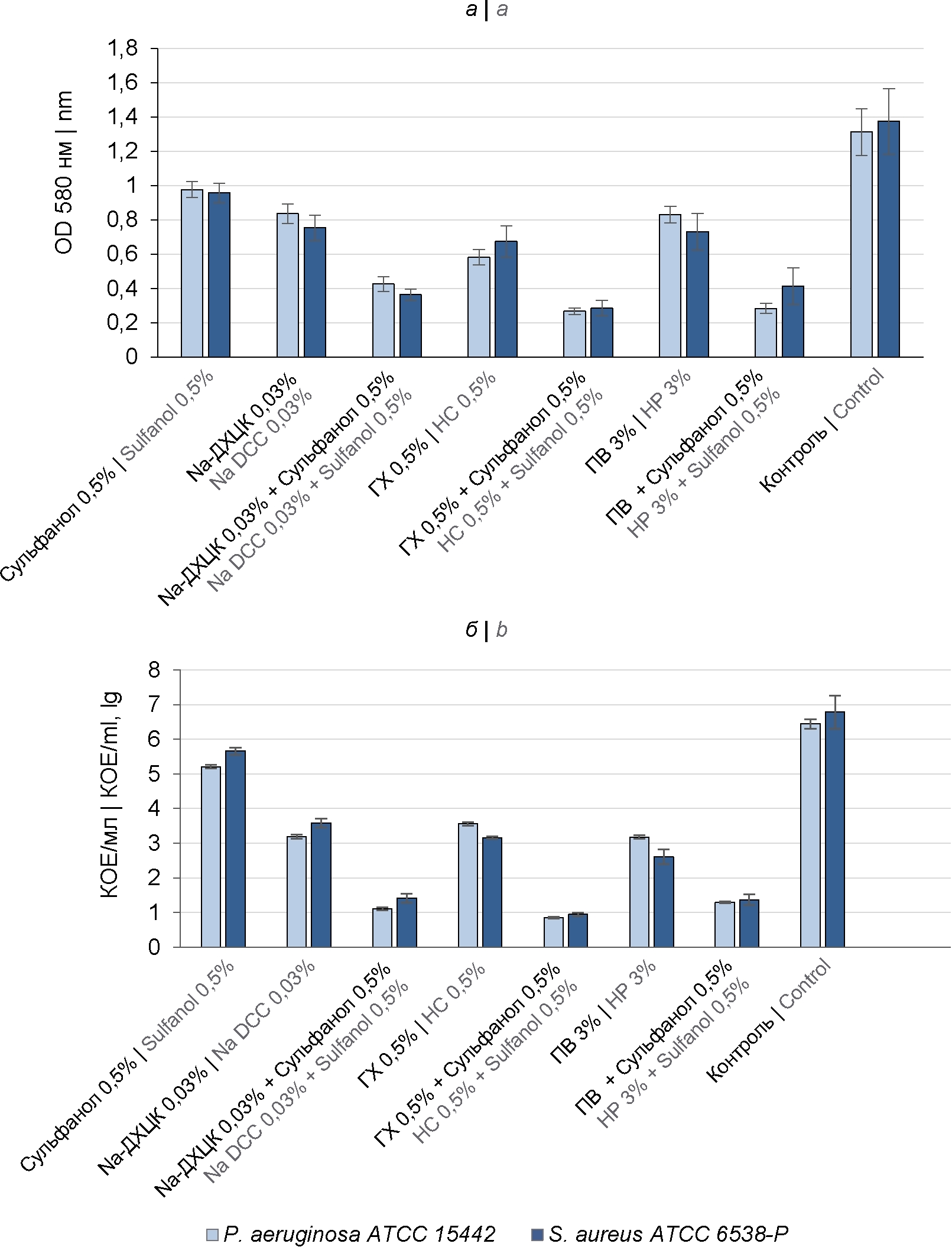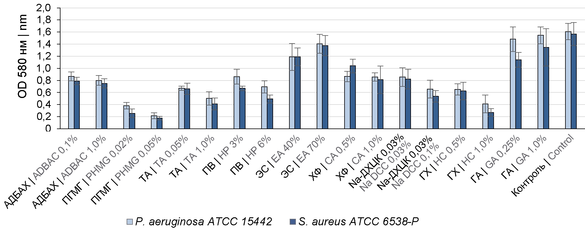 The tested cultures of microorganisms P. aeruginosa ATCC 15442 and S. aureus ATCC 6538-P formed BFs with a density of OD580 = 1.50 ± 0.19 after 24 hours. The average number of viable cells in BFs was 6.2 ± 0.7 lg.
