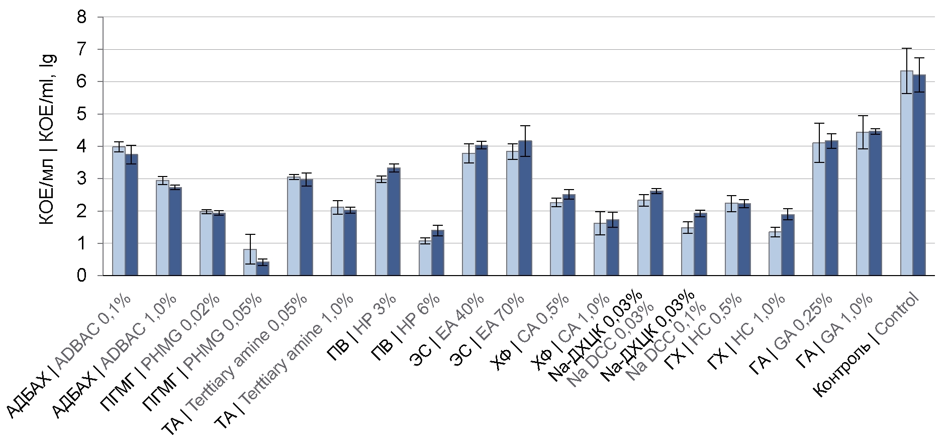 Conclusion. A promising potential in combating microbial biofilms is demonstrated by disinfectants from the group of oxidizing agents (chlorine-active and oxygen-containing), TA and PHMG; using ADBAC as an individual compound is ineffective; aldehydes and alcohols are unable to destroy BFs and eliminate microorganisms in them.