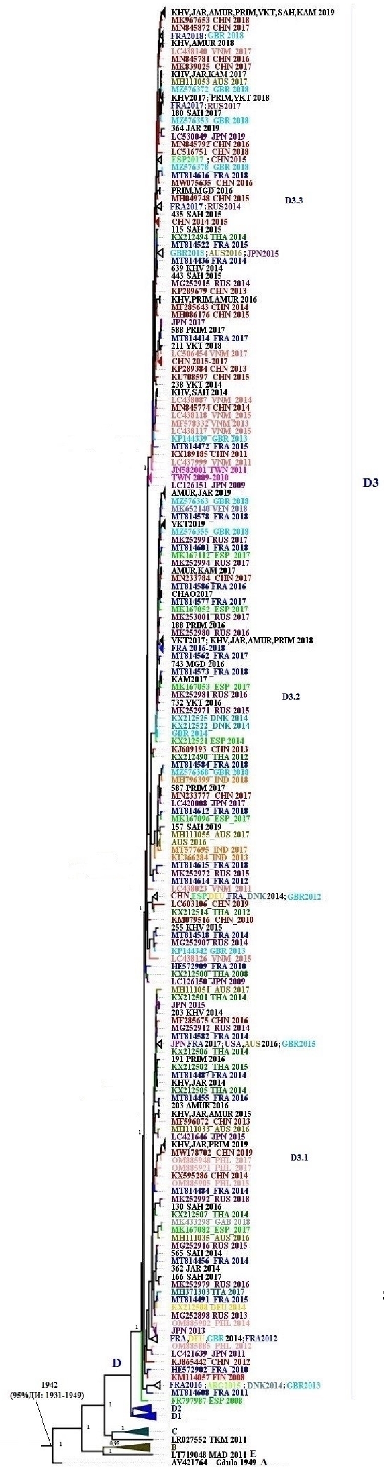 КВ-А6 подгруппы D3.1 (n = 18; 23,1%) достоверно кластеризовались с французскими и российскими штаммами и были идентифицированы в 5 субъектах (Хабаровский и Приморский края, ЕАО, Сахалинская и Амурская области) с 2014 по 2017 г. и в 2019 г. Общий предок для D3.1 циркулировал приблизительно в 2005 г. (95% ДИ 2005–2007).