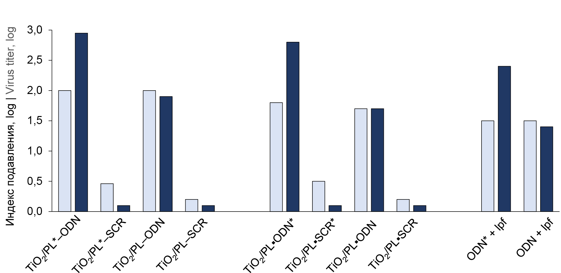 Antiviral activity of samples expressed as the logarithm of the virus production suppression index. TiO2-based nanocomposites contained complementary and non-complementary oligonucleotides to viral RNA (ODN and SCR, respectively); they contained the photoactive arylazide group on the polylysine residue or oligonucleotide (PL*, ODN*, or SCR*) or did not contain this group. The light and dark columns correspond to the results before and after UV irradiation of infected cell cultures with samples, respectively; lpf, lipofectamine.