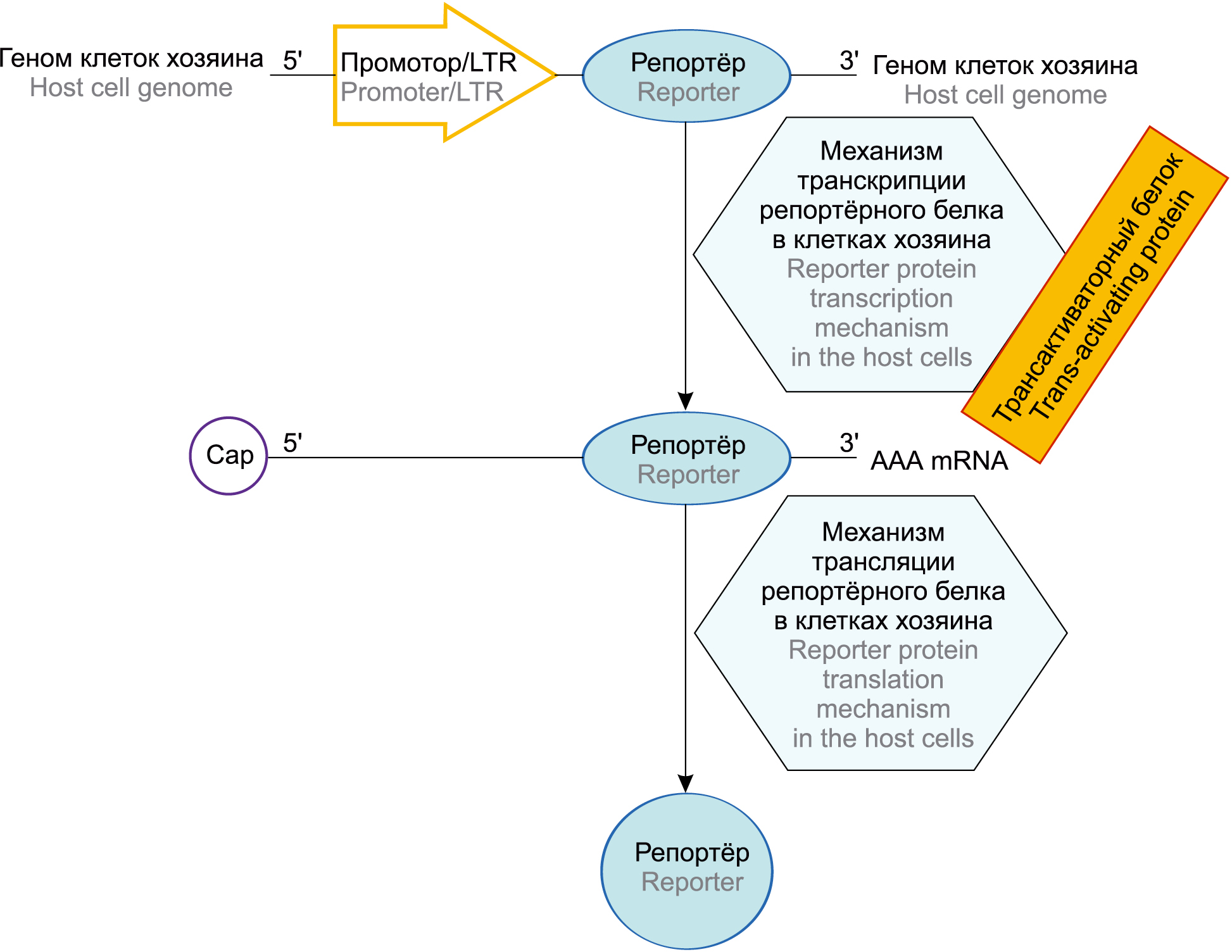 Молекулярная репортёрная система для обнаружения РНК-содержащих ретровирусов и вирусов с геномом двухцепочечной ДНК. В неинфицированных клетках нет синтеза мРНК с вирусного промотора. После инфицирования клеток начинаются транскрипция и трансляция репортёрного белка в присутствии вирусного белка. Геном или минигеном клеток хозяина — сокращенная версия вирусного генома, содержащая 3'- и 5'-концевые остатки генома, необходимые для репликации и транскрипции; промотор — участок ДНК, ответственный за связывание с РНК-полимеразой; LTR (long terminal repeat, длинный терминальный повтор) — участок генома, центр контроля экспрессии генов; репортер — ген, встраиваемый в генно-инженерную конструкцию и кодирующий нейтральные для клетки белки; трансактиваторный белок — регуляторный белок, участвующий в транскрипции вирусного генома; механизм транскрипции репортерного белка, осуществляемый в присутствии вирусного белка в клетках хозяина; механизм трансляции репортерного белка, осуществляемый в присутствии вирусного белка в клетках хозяина; Сар 5' — 5'-концевой остаток или участок генома; 3' ААА mRNA — 3'-концевой остаток поли-А-области матричной РНК.
