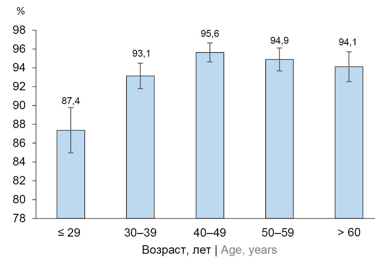 Screening for antibodies to VZV in medical workers of a multidisciplinary hospital revealed a high proportion of seropositive individuals (93.7%). Taking into account that the study involved individuals of a certain vulnerable population group (employees of the HCO), we did not extrapolate the results of the screening to the adult population of the country. At the same time, the obtained result is comparable with the data of population studies on assessment of immunity to VZV in European countries, indicating that more than 90% of adults in most of them are VZV seropositive. At the same time, the level of adult seropositivity is higher than in most Asian countries with warmer climates (India — 68.2%, Turkey — 77.8%, Thailand — 61.4%, Iran — 78.5%, etc.) [16].