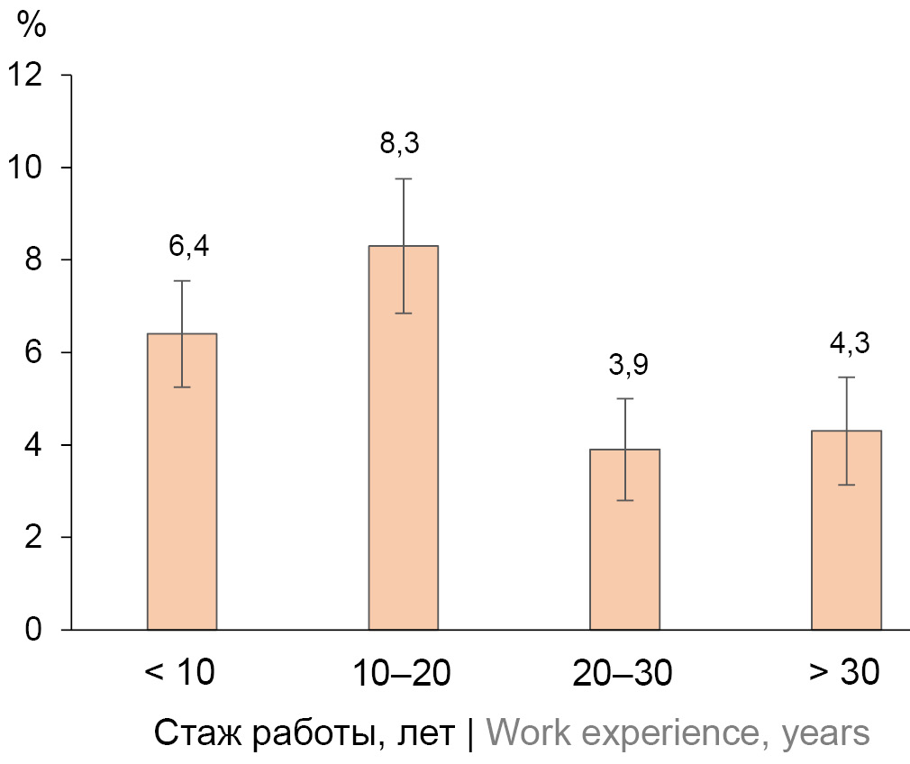 Work experience, years | < 10 | 454 | 29,3 |